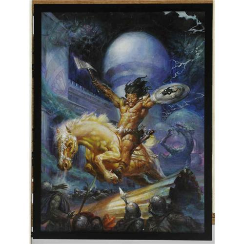 <B>Doug Beekman - Savage Sword of Conan # 233 Cover Original Art (Marvel, 1995).</B></I> Conan, Warrior-King of Cimmeria, rides headlong into battle, with armed foes before him and terrible monsters at his back. Painted for one of the last issues of this long-running magazine, Beekman contributes a masterpiece that fairly bristles with action and dramatic tension. From his masterful use of color to his unerring eye for composition, this piece, which measures approximately 18" x 24" on canvas board, is a great representation of a classic character, sure to awaken the barbarian in us all.