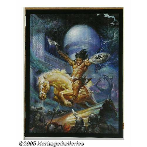 <B>Doug Beekman - Savage Sword of Conan # 233 Cover Original Art (Marvel, 1995).</B></I> Conan, Warrior-King of Cimmeria, rides headlong into battle, with armed foes before him and terrible monsters at his back. Painted for one of the last issues of this long-running magazine, Beekman contributes a masterpiece that fairly bristles with action and dramatic tension. From his masterful use of color to his unerring eye for composition, this piece, which measures approximately 18"" x 24"" on canvas board, is a great representation of a classic character, sure to awaken the barbarian in us all. <BR><BR><B>Important notice:</B> Heritage usually auctions material at the rate of 200-250 lots per hour. On some occasions eBay Live bid software or the Internet may not be able to keep up with the pace of the auction. We recommend placing a realistic absentee bid now as insurance to avoid disappointment. Occasionally the auctioneer may eliminate or reject an eBay Live bid, and the auctioneer may also reopen a lot after the close of the eBay live bidding (usually because we missed an audience bid), and may reject your bid even if it shows you as the winning bidder. By bidding via eBay Live, you agree that Heritage may award the lot to another bidder at its sole discretion under the circumstances described above or any other reasonable circumstances. Since eBay bids are not shown to us until we open the lot on the floor, we treat those bids just like floor bids. In most cases the floor responds before the eBay bid is presented to us, due to Internet lag time, so for consistency we have made it a policy that floor bids are always considered first over tie eBay live bids. Also please note that all Heritage lots purchased through eBay Live carry a 20% Buyer's Premium. Please make sure you read the Terms and Conditions before you bid. This lot is being auctioned in conjunction with a live floor auction by Heritage Galleries & Auctioneers. All final auction and invoice information will