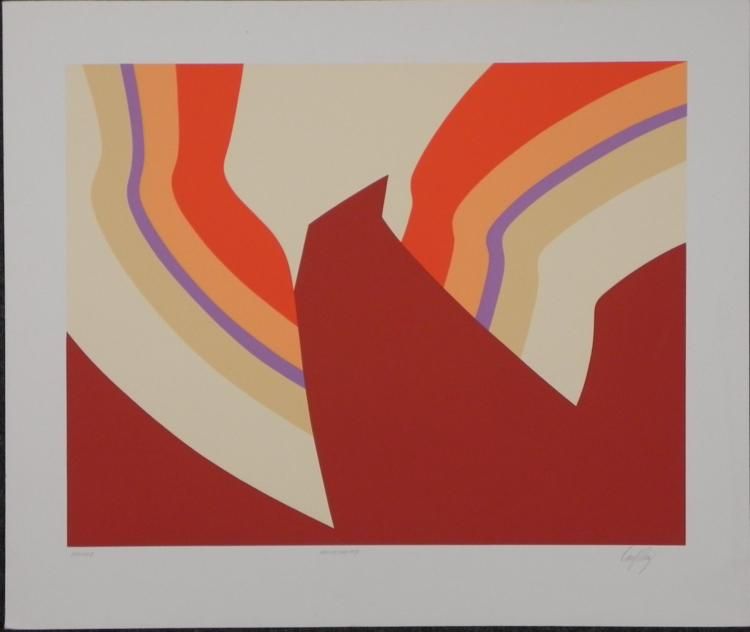 This is a rising phoenix in an abstract design. Artist: Doug Danz Signature: In pencil, lower right Title: Phoenix IEdition: Proof, Handling CopyMedium: Lithograph on paperSheet size: 25 1/4 x 30 inches Condition: Very good; surface scuff at the right ma