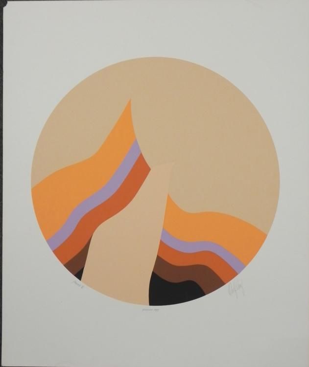 This phoenix is presented in a Modernist style, with layers of warm colors. Artist: Doug Danz Signature: In pencil, lower right Title: Phoenix VIEdition: Proof, Handling CopyMedium: Lithograph on paperSheet size: 25 1/4 x 30 inches Condition: Very good; surface crease near the center