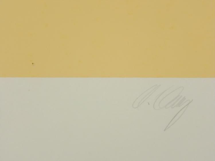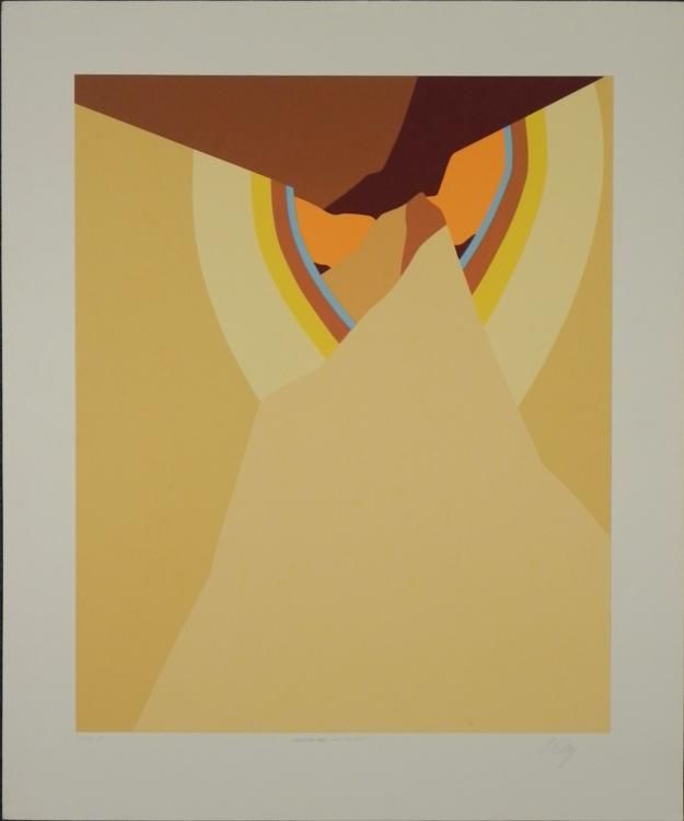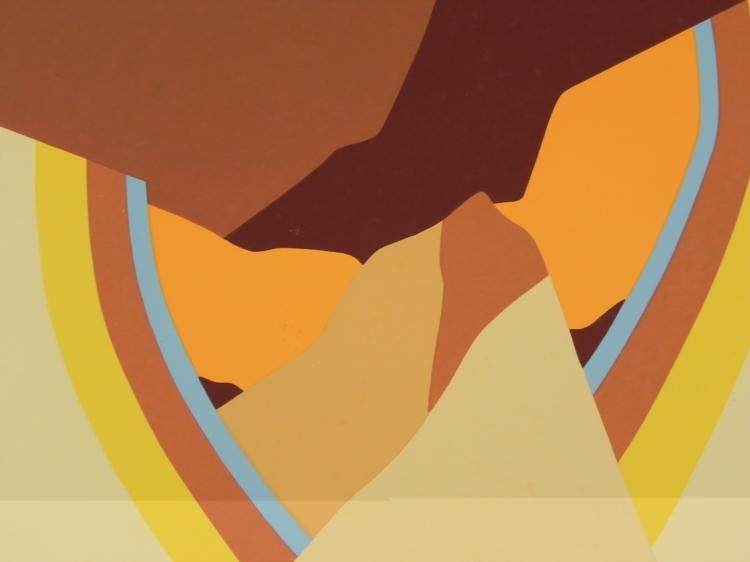 Here is a landscape that appears to have mountains and a valley in colorful geometric layers. Artist: Doug Danz Signature: In pencil, lower right Title: Terra IIEdition: Proof, Handling copy Medium: Lithograph on paperSheet size: 25 1/2 x 30 1/2 inches Condition: Very good; surface scuffs on the left side