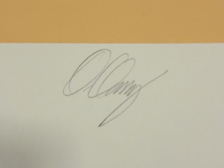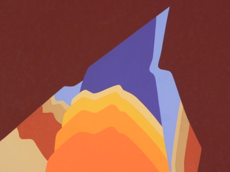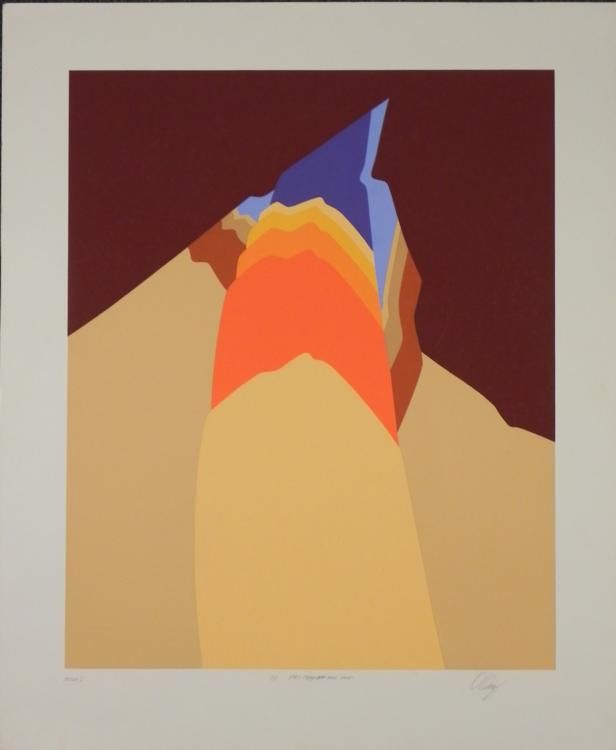 This modern landscape appears to have layers of rocks at a pointy crest. Artist: Doug Danz Signature: In pencil, lower right Title: Terra IEdition: Artist's Proof, marked A/P Medium: Lithograph on paperSheet size: 25 1/2 x 30 1/2 inches Condition: Very good