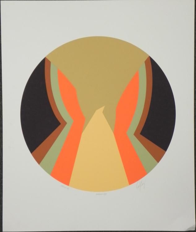 This modern art print has a sleek form of a phoenix in a round design. Artist: Doug Danz Signature: In pencil, lower right Title: Phoenix VIIEdition: Artist's Proof, marked Handling Copy Medium: Lithograph on paperSheet size: 25 x 30 inches Condition: E