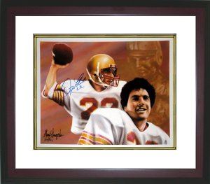 Doug Flutie played football for Boston College from 1981 to 1984, and won the Heisman Trophy and the Davey O'Brien National Quarterback Award in his senior year (1984). He gained national attention in 1984 when he quarterbacked the Eagles to victory in a high-scoring, back-and-forth game against the Miami Hurricanes. On the last play of the game, Flutie scrambled away from the defense and threw a Hail Mary pass that was caught in the end zone by Gerard Phelan, giving BC a 47-45 win. Doug Flutie has hand signed this Boston College Hail Mary In Arms 11x14 Color Lithograph. White Mat and Mahogany Color Framed as shown. Litho created by Gary Longordo and it is autographed by him as well. Certificate of Authenticity from Athlon Sports.