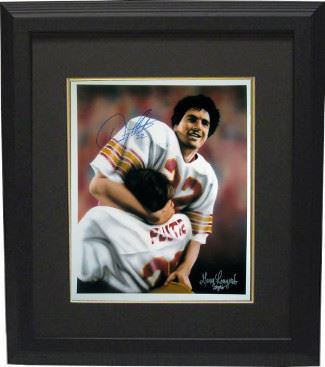 Doug Flutie played football for Boston College from 1981 to 1984, and won the Heisman Trophy and the Davey O'Brien National Quarterback Award in his senior year (1984). He gained national attention in 1984 when he quarterbacked the Eagles to victory in a high-scoring, back-and-forth game against the Miami Hurricanes. On the last play of the game, Flutie scrambled away from the defense and threw a Hail Mary pass that was caught in the end zone by Gerard Phelan, giving BC a 47-45 win. Doug Flutie has hand signed this Boston College Hail Mary In Arms 11x14 Color Lithograph. Black Mat and Black Color Framed as shown. Litho created by Gary Longordo and it is autographed by him as well. Certificate of Authenticity from Athlon Sports.