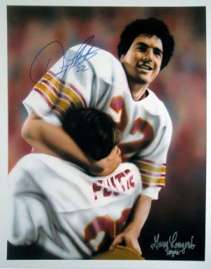 Doug Flutie played football for Boston College from 1981 to 1984, and won the Heisman Trophy and the Davey O'Brien National Quarterback Award in his senior year (1984). He gained national attention in 1984 when he quarterbacked the Eagles to victory in a high-scoring, back-and-forth game against the Miami Hurricanes. On the last play of the game, Flutie scrambled away from the defense and threw a Hail Mary pass that was caught in the end zone by Gerard Phelan, giving BC a 47-45 win. Doug Flutie has hand signed this Boston College Hail Mary In Arms 11x14 Color Lithograph. Litho created by Gary Longordo and it is autographed by him as well. Certificate of Authenticity from Athlon Sports.
