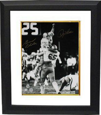 Doug Flutie played football for Boston College from 1981 to 1984, and won the Heisman Trophy and the Davey O'Brien National Quarterback Award in his senior year (1984). He gained national attention in 1984 when he quarterbacked the Eagles to victory in a high-scoring, back-and-forth game against the Miami Hurricanes. On the last play of the game, Flutie scrambled away from the defense and threw a Hail Mary pass that was caught in the end zone by Gerard Phelan, giving BC a 47-45 win. Doug Flutie and Gerard Phelan have hand signed this Boston College Eagles 16x20 Photo. MAB Hologram and Certificate of Authenticity from Athlon Sports. Custom White Mat and Premium Black Framed as shown.
