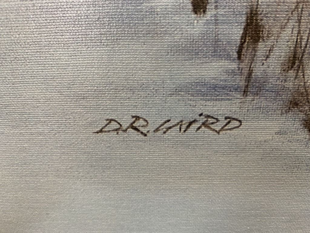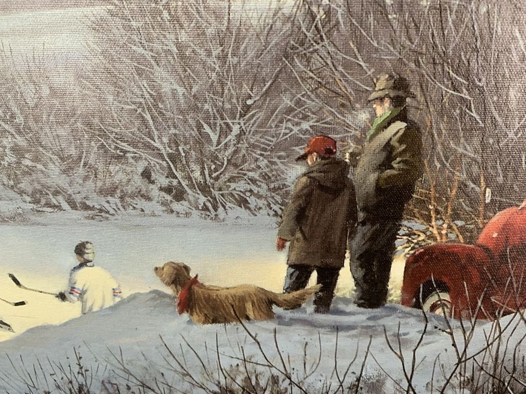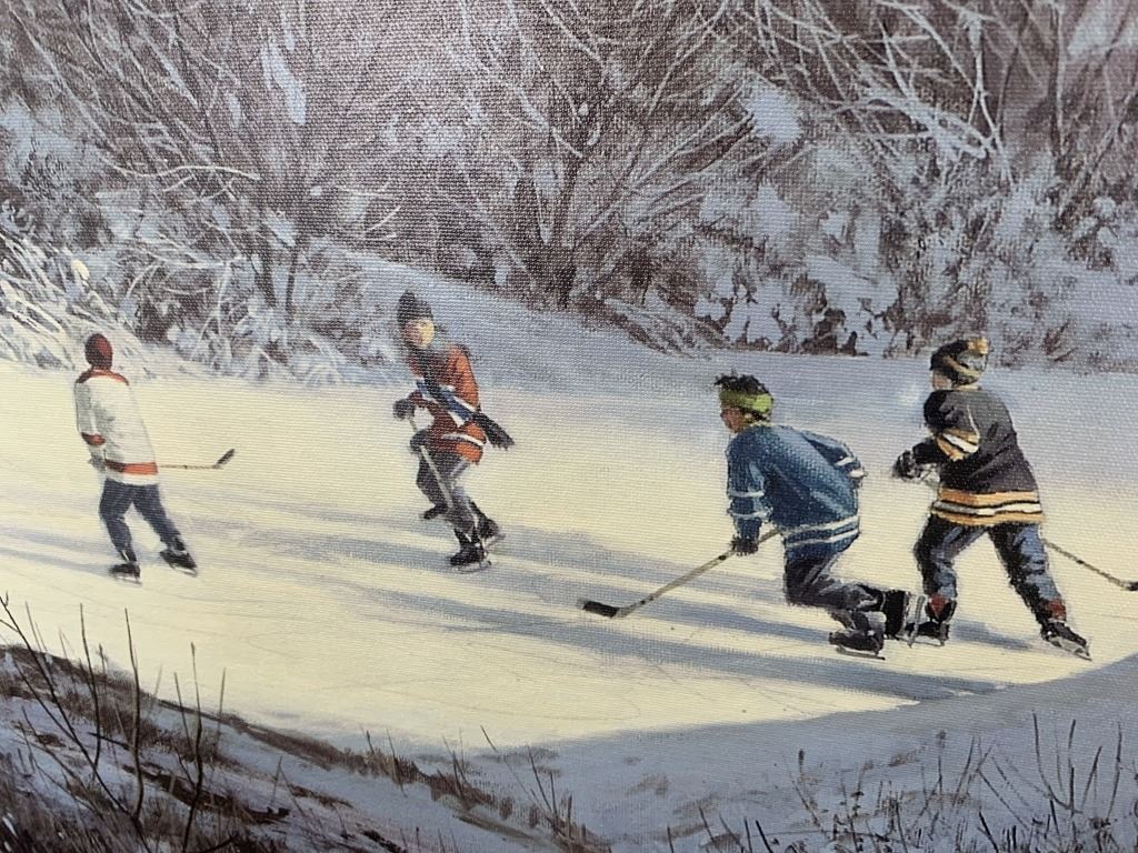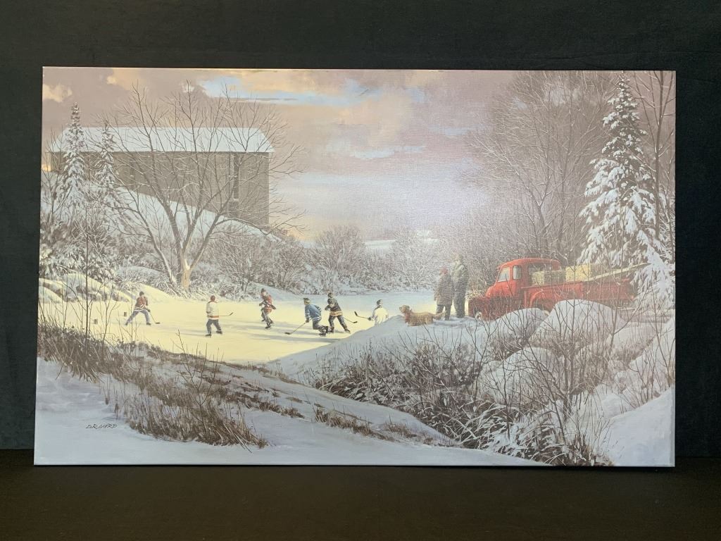 Doug Laird's "From the Mist" open edition canvas, professionally stretched over a stretcher board. This piece is of children playing hockey on a pond at night. The pond is illuminated by the lights of an old red pickup truck.