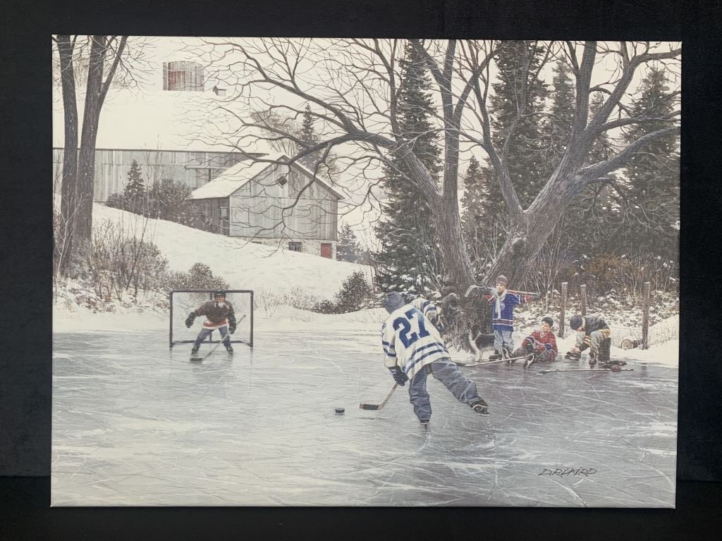Doug Laird's "Penalty Shot" open edition canvas, stretched over a stretcher board. This piece is of children playing hockey on a pond. The children are wearing Toronto Maple Leafs, Edmonton Oilers, Montreal Canadiens, and Boston Bruins jerseys.