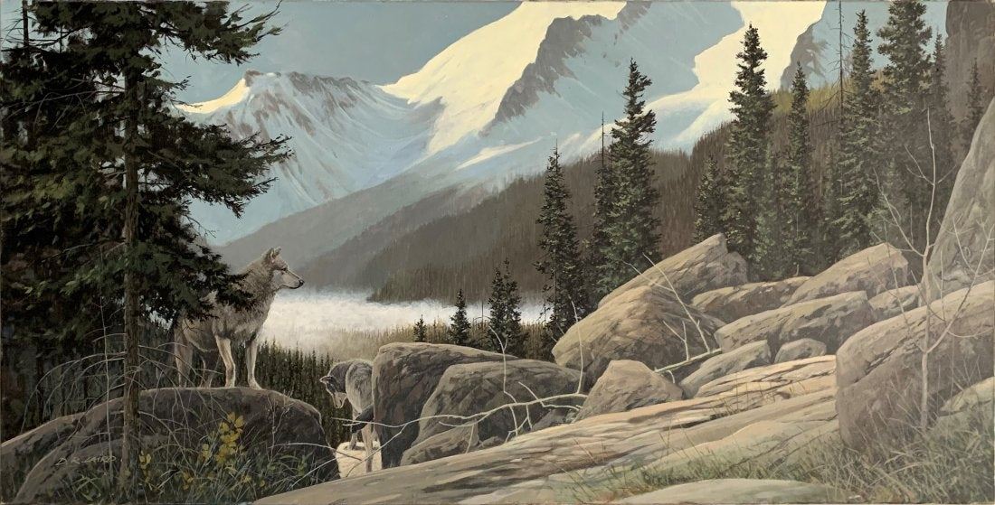 Doug seldom uses anything finer than a number seven brush. Larger brushes can have as fine a point as smaller ones. There is more body to a larger brush which allows more control over the paint. Once into a painting, Doug basically sticks to his original sketch. However, things develop with various twists and turns along the way in order to achieve the desired effect. A great deal of time is spent looking at the painting, studying it before the final brush strokes are applied.Image- 30" x 48". Frame- 37" x 55"