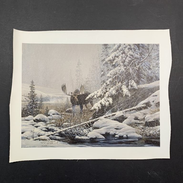 Doug Laird's "Winter Overture" limited edition canvas, signed lower left, and numbered 7/1250 lower right. This piece is of a a moose standing behind a tree, with the lightest of snowfalls. This canvas is in mint condition, and is included with a certificate of authenticity.