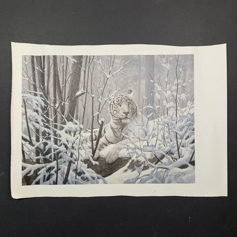 Doug Laird's "Winter White" limited edition canvas, signed lower right, and numbered 7/950 lower right. This piece is of a white tiger laying down, in the middle of the forest in winter. This canvas is in mint condition, and is included with a certificate of authenticity.