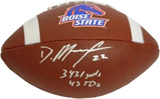 Doug Martin attended Boise State University from 2007 to 2011. He finished his career with 3,431 yards on 617 carries with 43 touchdowns. As a senior in 2011, Martin was the MVP of the 2011 Maaco Bowl Las Vegas after returning the opening kickoff 100 yards for a touchdown and rushing for 151 yards and a touchdown. Throughout his college career, Martin started 25-of-51 games at Boise State and was a first-team All-Mountain West Conference selection in 2011 and All-Western Athletic Conference in 2010. Martin ranks third in school history with 43 rushing touchdowns and 48 total touchdowns, fifth with 3,431 rushing yards and sixth with 617 rushing attempts. Doug Martin has hand signed this Boise State Broncos Brown Logo Football with dual 3431 yds & 43 TDs inscriptions. Schwartz Sports Hologram and Certificate of Authenticity from Athlon Sports.