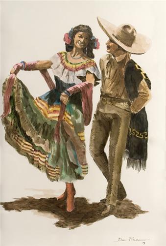 Doug Prine (late 20th Century). Spanish Dancers. 35 1/2" x 23 1/2" pen, ink & watercolor. Signed lower right. (est $1000-2000)