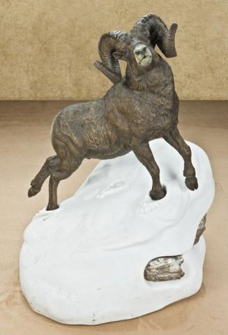 Doug Van Howd bronze of a ram on a snow-covered rock, #1 of 50. Measuring 16” in length by 13” in width by 21” tall. This contemporary artist is noted for his highly realistic sculpture and paintings. Mr. Robert Petersen actively collected his work and pursued the first example numbered 1".From the Robert Petersen Collection. Est: $1 500 - $3 000"
