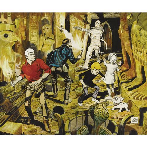 <B>Doug Wildey - Jonny Quest "Curse of Anubis" Illustration Original Art (undated).</B></I> Doug Wildey, famed creator of "Jonny Quest," was one of the best cartoonists ever to work in animation. His work in the action-adventure genre for Hanna-Barbera Productions was the first television animation to seriously rival the high quality set by the theatrical Fleischer/Paramount Studio "Superman" cartoons. In the nineties, Doug Wildey recreated several memorable scenes from classic sixties "Jonny Quest" episodes as mixed-media drawings for his fans. Race Bannon, Dr. Benton Quest, Jonny, Hadji, and Bandit - the gang's all here, to battle the threat of a re-animated mummy in "Curse of Anubis." The image area of this superb mixed-media piece is 24" x 20", and the art is in Excellent condition. The piece has been nicely framed. <BR><BR><B>Important notice:</B> Heritage usually auctions material at the rate of 200-250 lots per hour. On some occasions eBay Live bid software or the Internet may not be able to keep up with the pace of the auction. We recommend placing a realistic absentee bid now as insurance to avoid disappointment. Occasionally the auctioneer may eliminate or reject an eBay Live bid, and the auctioneer may also reopen a lot after the close of the eBay live bidding (usually because we missed an audience bid), and may reject your bid even if it shows you as the winning bidder. By bidding via eBay Live, you agree that Heritage may award the lot to another bidder at its sole discretion under the circumstances described above or any other reasonable circumstances. Since eBay bids are not shown to us until we open the lot on the floor, we treat those bids just like floor bids. In most cases the floor responds before the eBay bid is presented to us, due to Internet lag time, so for consistency we have made it a policy that floor bids are always considered first over tie eBay live bids. Also please note that all Heritage lots purchased through eBay Live carry a 22.5% Buyer's Premium. Please make sure you read the Terms and Conditions before you bid. This lot is being auctioned in conjunction with a live floor auction by Heritage Auction Galleries. All final auction and invoice information will be supplied by Heritage Auction Galleries, and all other information should be considered preliminary. Lot:41001 <BR><BR><B>Winning Notification and Billing:</B> After the FINAL session in this auction is complete, Heritage will send e-mail and snail mail invoices. This process normally takes several days. All final auction and invoice information will be supplied by Heritage Auction Galleries, and all other information should be considered preliminary. <BR><BR>This auction will be conducted on a live auction floor and over the Internet through eBay Live. If you choose to place an absentee bid, please take a moment to <font color='#0000ff'><u><a href='http://pages.ebay.com/liveauctions/help/before/laabsentee.html'>learn how eBay Live absentee bidding works</a></u></font><font color='#000000'>