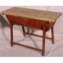 Early dough box in original red paint, Ca. 1830; constructed of maple and pine with mortised joints and iron nails; stretcher base with splayed legs; the single board "scrubbed" top is designed with 2 vertical supports which are dove-tailed across each; finish is nice and worn; some old repairs; 29.5" tall x 42.5" long x 17.75" wide