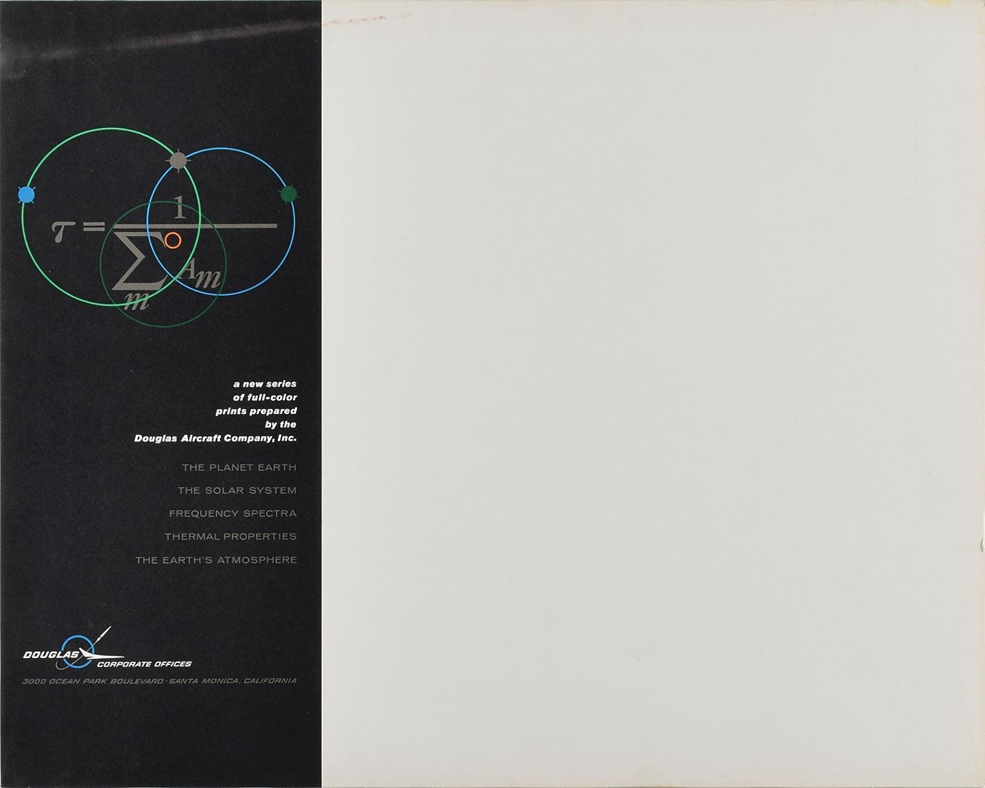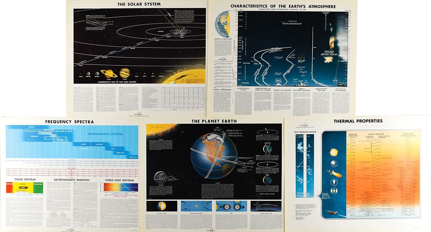 Group of five color 20 x 16 educational prints detailing Earth's atmosphere and the solar system, published by the Douglas Aircraft Company in September 1962, with titles including: "Frequency Spectra," "The Planet Earth," "Thermal Properties," "The Solar System," and "Characteristics of the Earth's Atmosphere." Housed in an oversized official Douglas folder. In overall fine condition, with slight soiling to the front of the folder.