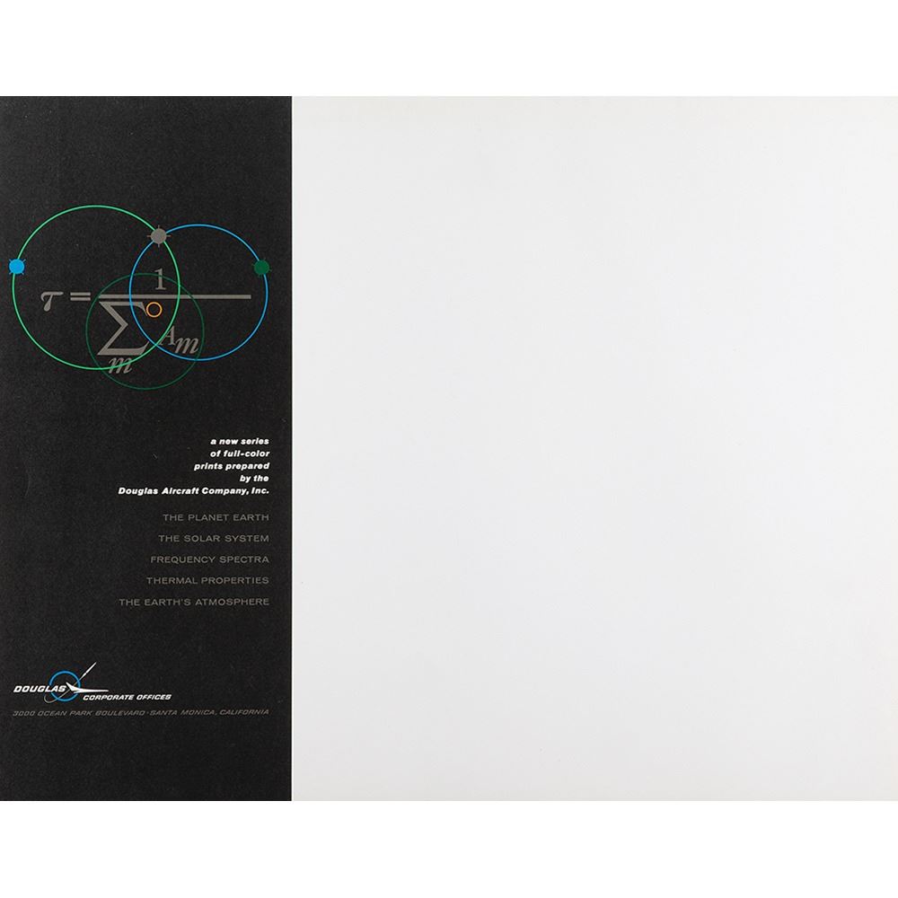 Group of five color 20 x 16 educational prints detailing Earth's atmosphere and the solar system, published by the Douglas Aircraft Company in September 1962, with titles including: "Frequency Spectra," "The Planet Earth," "Thermal Properties," "The Solar System," and "Characteristics of the Earth's Atmosphere." Housed in an oversized official Douglas folder. In overall fine condition.