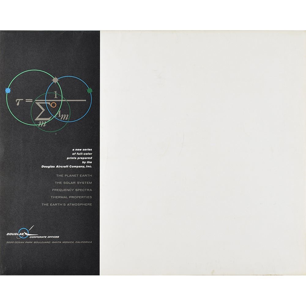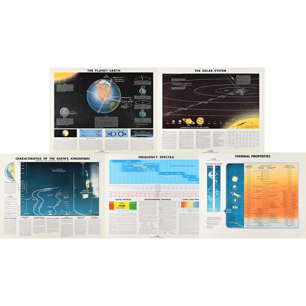 Group of five color 20 x 16 educational prints detailing Earth's atmosphere and the solar system, published by the Douglas Aircraft Company in September 1962, with titles including: "Frequency Spectra," "The Planet Earth," "Thermal Properties," "The Solar System," and "Characteristics of the Earth's Atmosphere." Housed in an oversized official Douglas folder. In overall fine condition.