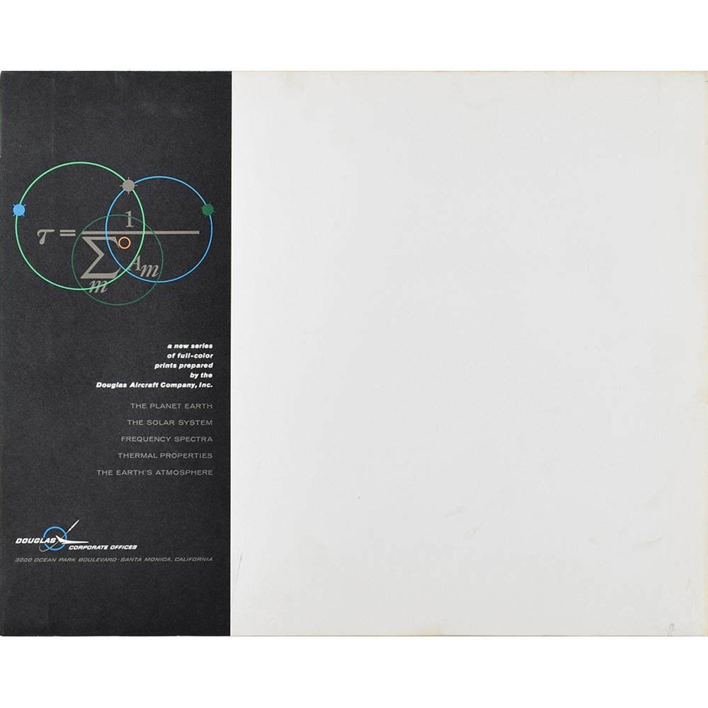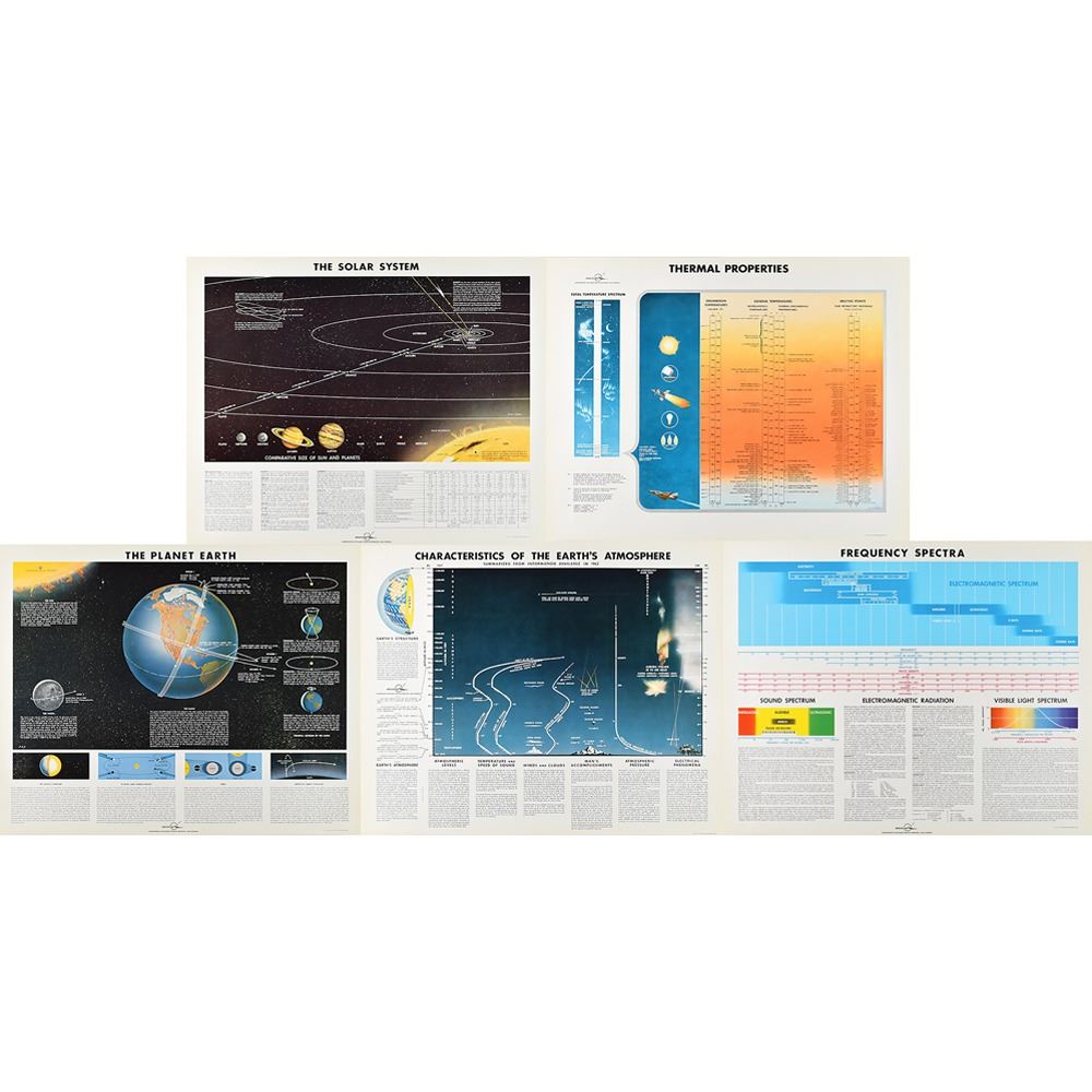 Group of five color 20 x 16 educational prints detailing Earth's atmosphere and the solar system, published by the Douglas Aircraft Company in September 1962, with titles including: "Frequency Spectra," "The Planet Earth," "Thermal Properties," "The Solar System," and "Characteristics of the Earth's Atmosphere." Housed in an oversized official Douglas folder. In overall fine condition.