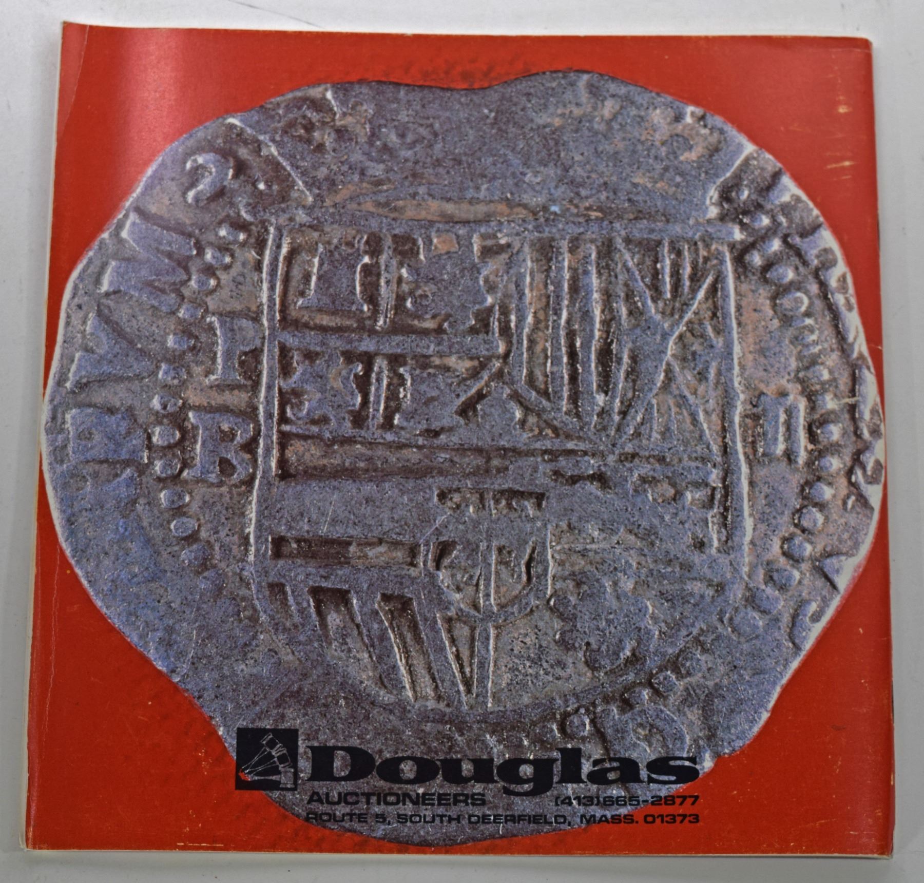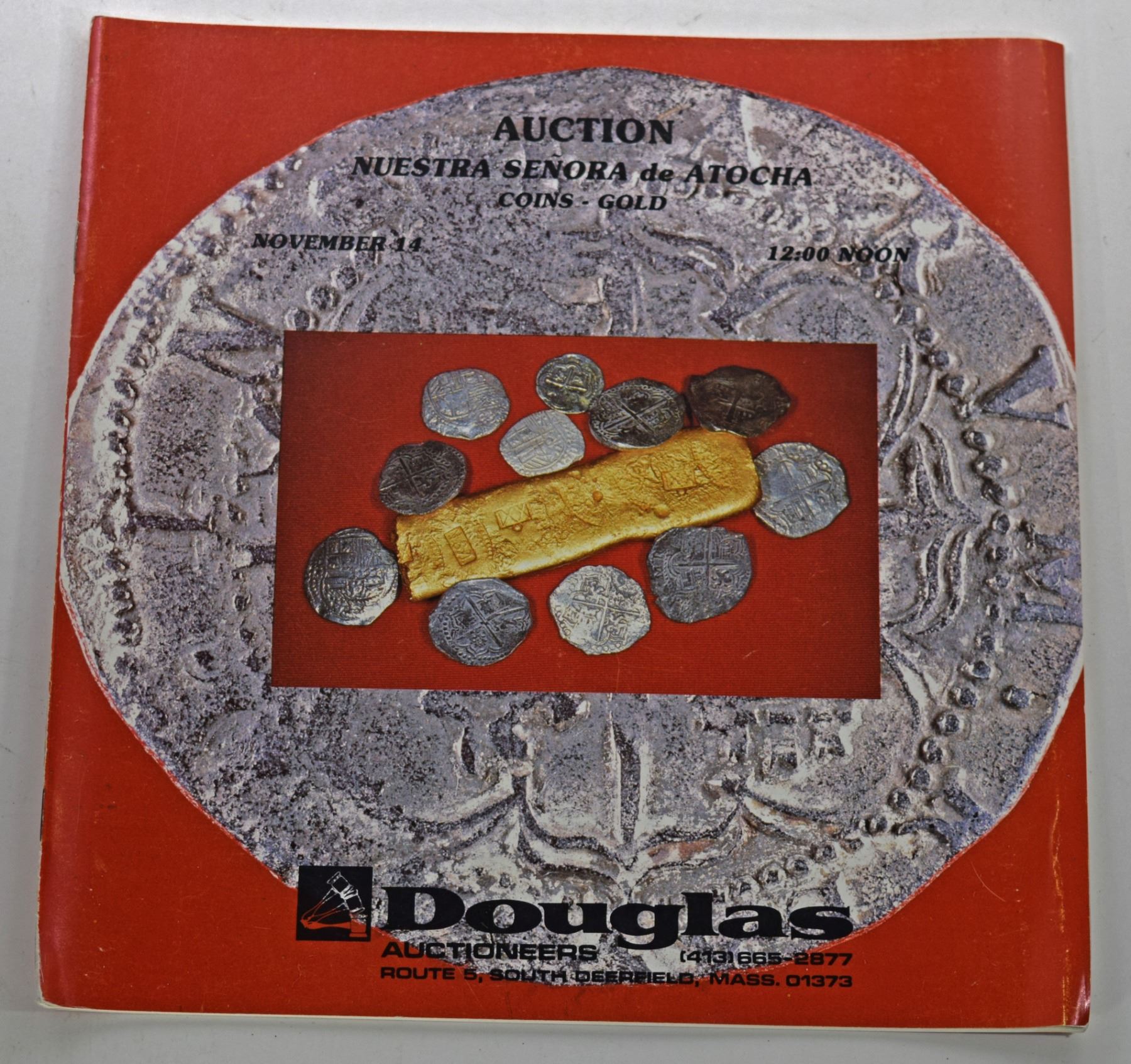 Douglas Auctioneers. NUESTRA SENORA DE ATOCHA COINS - GOLD. November 14, 1987. 8vo, 22 pages; Softcover; Includes xerox copy of consignor statement; This auction catalog contains 500 lots of 1, 2, 4 and 8 Reales cobs (comprising about 2000 coins) and one gold ingot from the “Atocha”. The catalog also includes a one-page history of the 1622 Fleet. Subject: History - Sunken Treasure