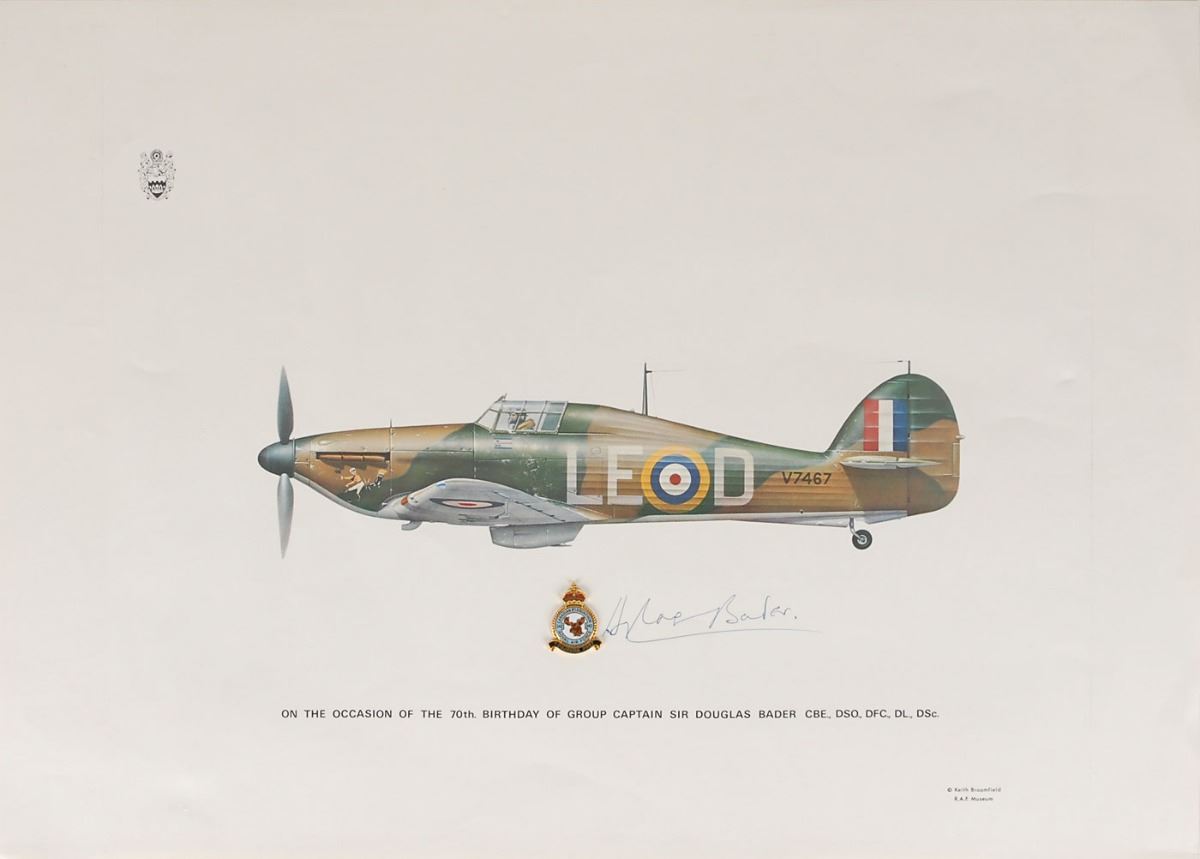Color 21 x 15 print of Bader’s No. 242 Squadron Hurricane LE–D presented “On the occasion of the 70th. birthday of Group Captain Sir Douglas Bader CBE., DSO., DFC., DL., DSc.,” signed in ballpoint by Bader, with an affixed Canadian Squadron Royal Air Force Toujours Pret pin. In fine condition, with scattered overall creasing.