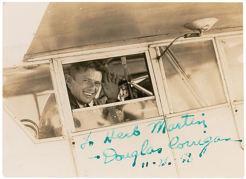 Vintage glossy 4 x 3 photo of Corrigan waving goodbye before takeoff, signed and inscribed in green fountain pen “To Herb Martin, Douglas Corrigan, 11-26-38.” In very good condition, with scattered creases and impressions, a staple hole to the upper left, and irregular adhesion to the inscription and signature.