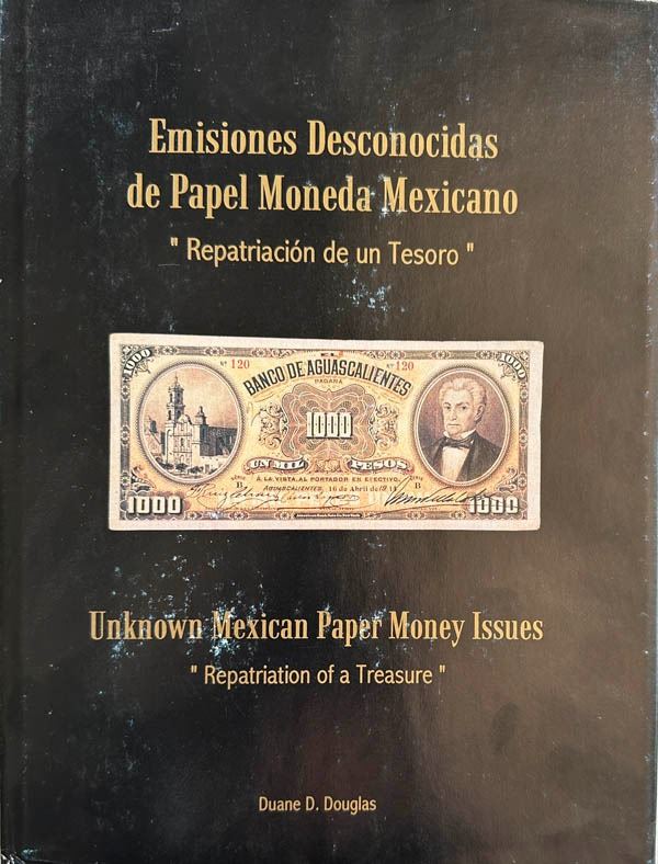 Douglas, Duane D., Emisiones Desconocidas de Papel Moneda Mexicano/Uknown Mexican Paper Money Issues, published 1998 hard bound 200 pages with black and white illustrations; documented research on the the discovery of a previously unknown Mexican currency prior to 1914, found in a large chest of the Treasury Department in the United States and returned to Mexico. limited Edition Of 1000; cover is worn Dedication signed to David Lisot by the author Duane D. Douglas dated June 10, 2000.. Estimate $150 - 200.