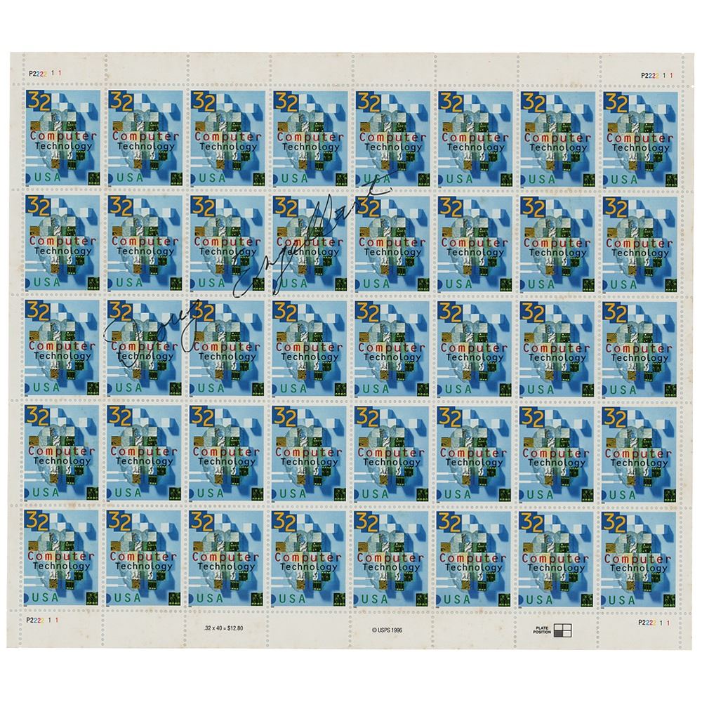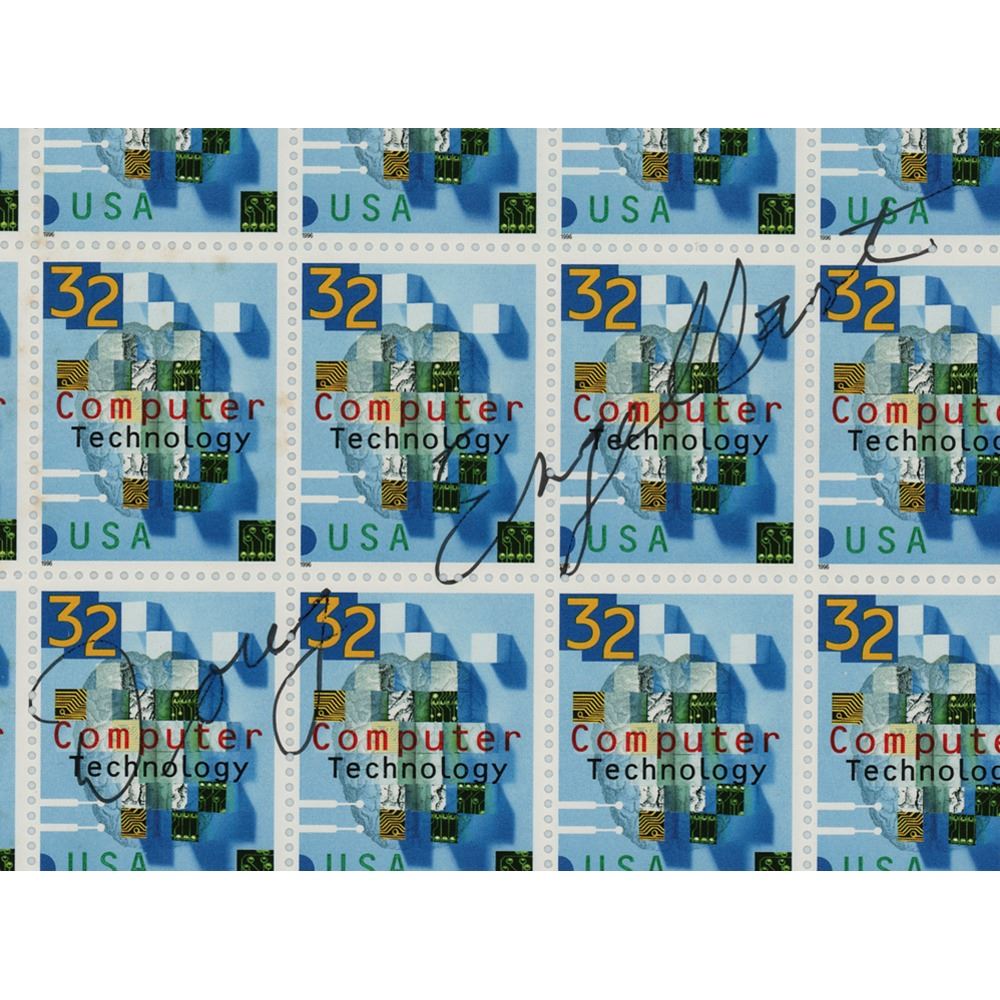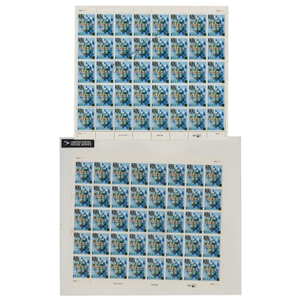 Complete block of forty 32-cent "Computer Technology" postage stamps, signed across the center in black felt tip, "Doug Engelbart." In fine condition. Accompanied by an unsigned example of the same stamp sheet.