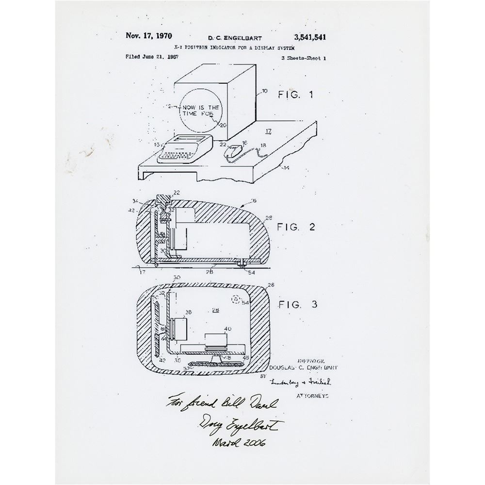 Rare, early three-button 'skeleton' computer mouse designed by computer pioneer Douglas Engelbart, measuring approximately 4 x 2.75 x 2, which utilizes two metal discs (corresponding to the X-axis and Y-axis) on the bottom to locate the position of the cursor, rather than a ball or optical light that came to be used later. Complete with its original cord, terminating in a serial connector. Missing its outer case, this 'skeleton' version of an early Engelbart mouse is fascinating from both visual and tactile perspectives. In fine condition. Accompanied by a glossy 8.5 x 11 photo of a diagram for Engelbart's computer mouse patent issued in 1970, entitled "X-Y Position Indicator for a Display System," signed and inscribed in the lower border in black felt tip, "For friend Bill Daul, Doug Engelbart, March 2006."