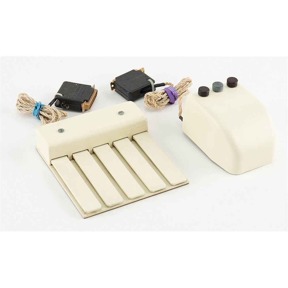 The keyset and three-button mouse also worked togetherthe keyset's 31 combinations permitted input of all 26 letters of the alphabet, plus standard punctuation marks (comma, period, semicolon, question mark, and space). Used in conjunction with the keyset, the mouse buttons functioned as shift and command keys: with the middle button pressed, letters shifted to uppercase and other punctuation marks were accessible; pressing the left mouse button allowed entry of numbers and a further selection of punctuation and symbols.