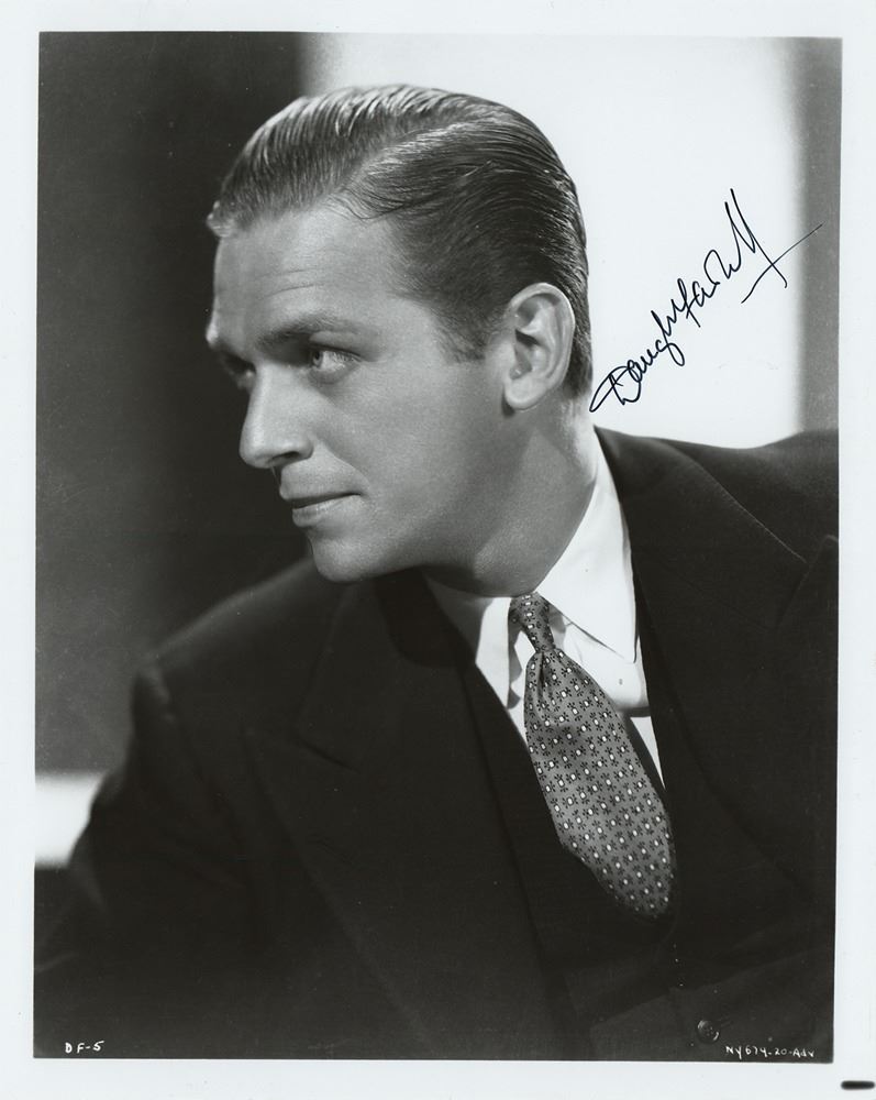 Glossy 8 x 10 photo of Douglas Fairbanks, Jr. in a handsome profile pose, signed in black felt tip. In very fine condition. Accompanied by a compliments sheet from Fairbanks.