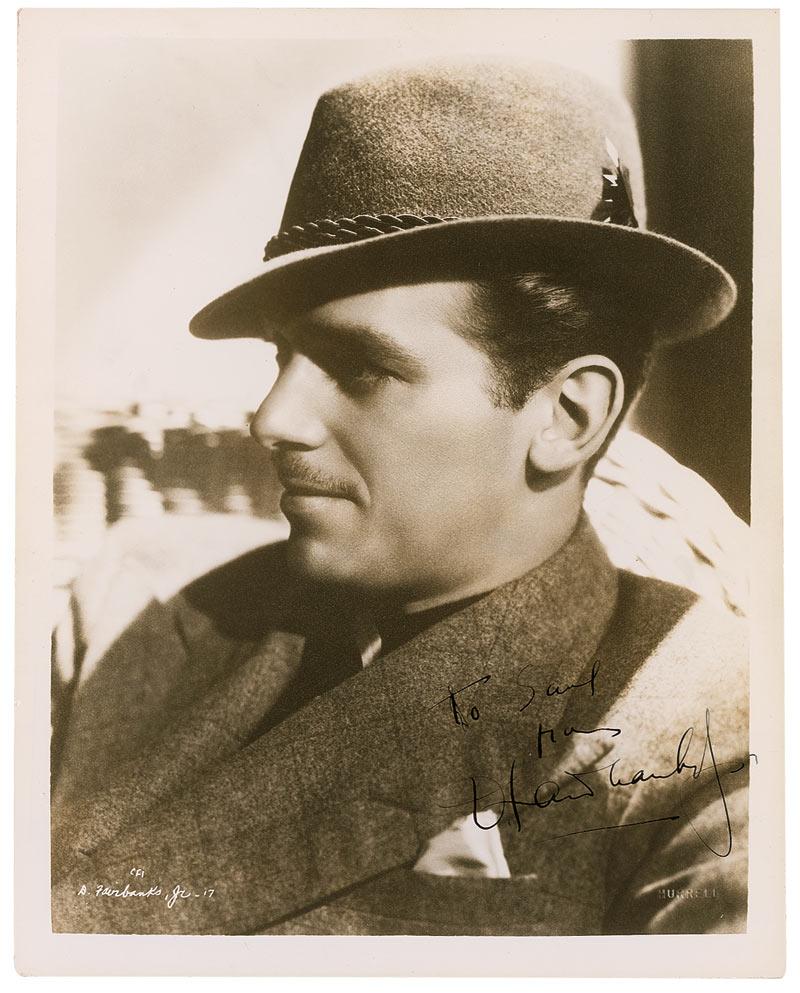 Debonair vintage glossy 8 x 10 photo, signed and inscribed in-person in fountain pen “To Saul, From Douglas Fairbanks, Jr.” Reverse of photo bears collector’s stamp date of July 5, 1940, the date the signature was acquired. In fine condition, with trivial surface creasing and small gouge to left border. Saul Goodman Collection.