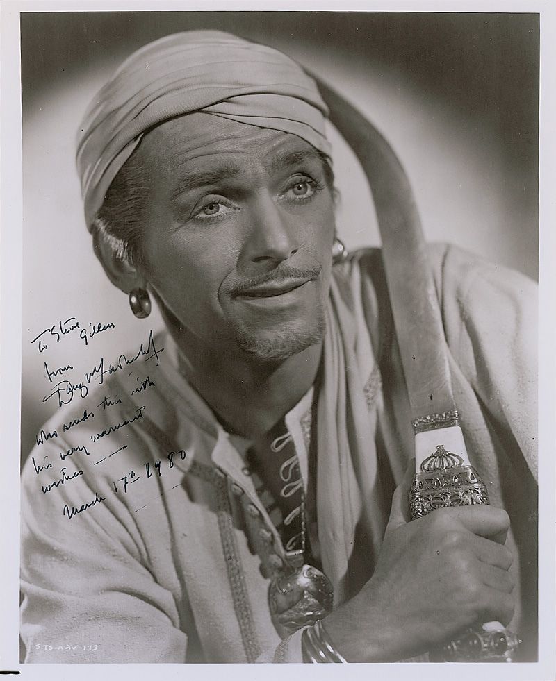 Glossy 8 x 10 photo of Fairbanks as Sinbad, signed and inscribed in black ink “To Steve Gillen from Douglas Fairbanks, Jr, who sends this with his very warmest wishes—March 17th 1980.” In fine condition, with some scattered light spotting and rubbing to finish.