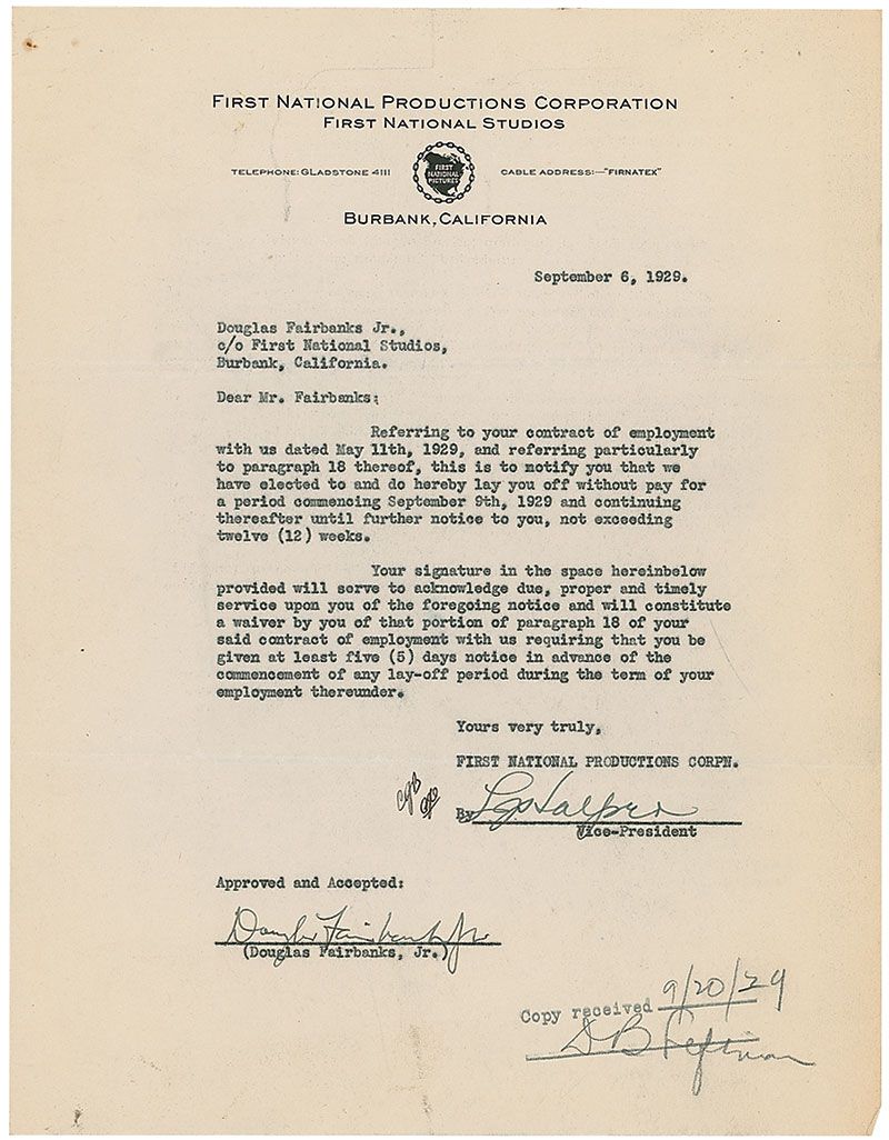 DS, one page, 8.5 x 11, September 6, 1929. First National Productions Corporation of Burbank, California, terminating Fairbanks’s contract for a period of time. In part: “This is to notify you that we have elected to and do hereby lay you off without pay for a period commencing September 9th, 1929 and continuing thereafter until further notice to you, not exceeding twelve (12) weeks.” Signed at the conclusion by Fairbanks, Jr., and a studio vice president. Light scattered creases and soiling, a few office notations, and staple holes and paperclip impressions to upper border, otherwise fine condition.
