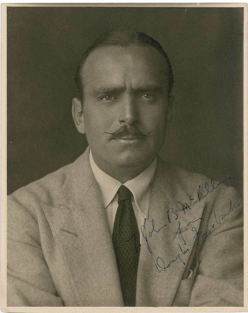 Vintage matte-finish 8 x 10 photo, signed and inscribed in fountain pen “To John B. McKillen from Douglas Fairbank.” Scattered light edge and corner tip creasing, and some light silvering to edges and background, otherwise fine condition.