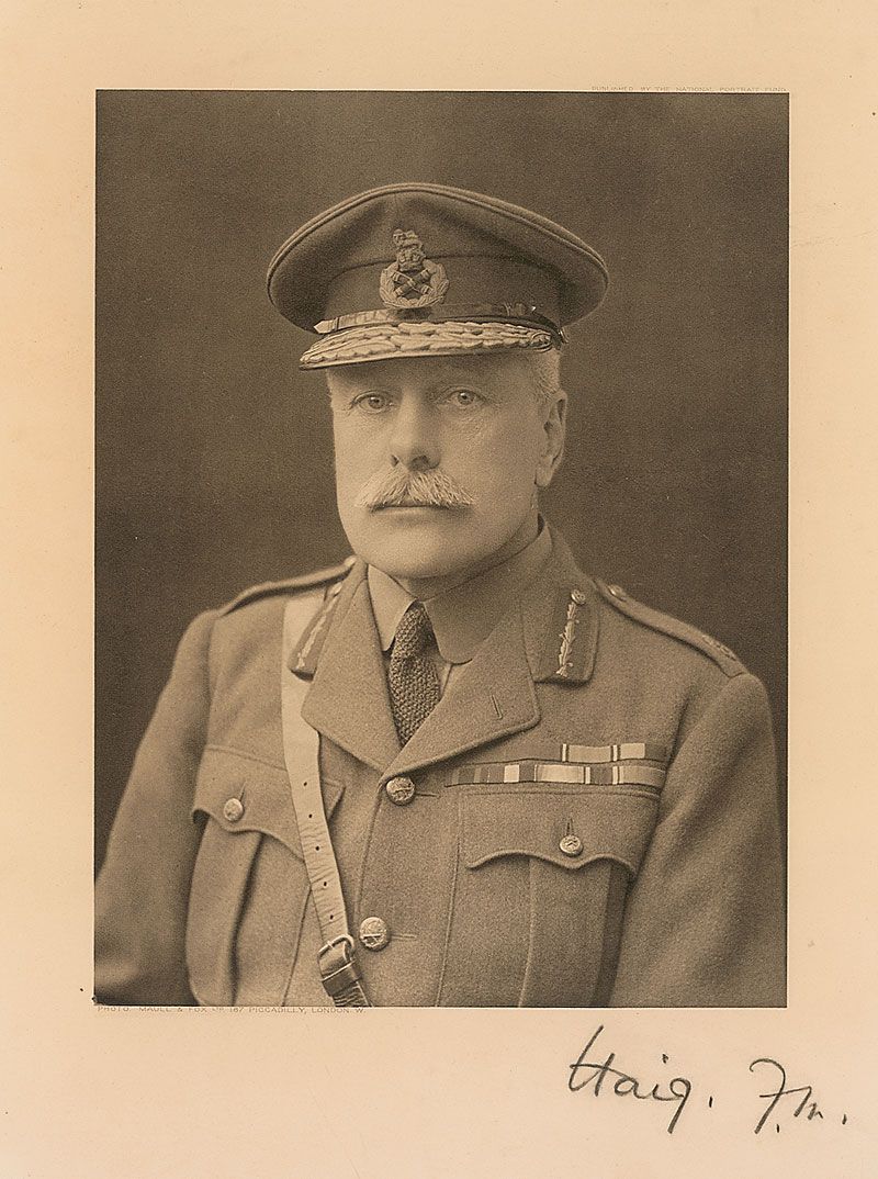 Field marshal and commander-in-chief of the British expeditionary forces in France and Flanders during WWI (1861–1928). Exceptional vintage matte-finish 8.75 x 11.5 portrait of Haig in uniform, signed in the lower border in pencil, “Haig, F. M.” In fine condition.