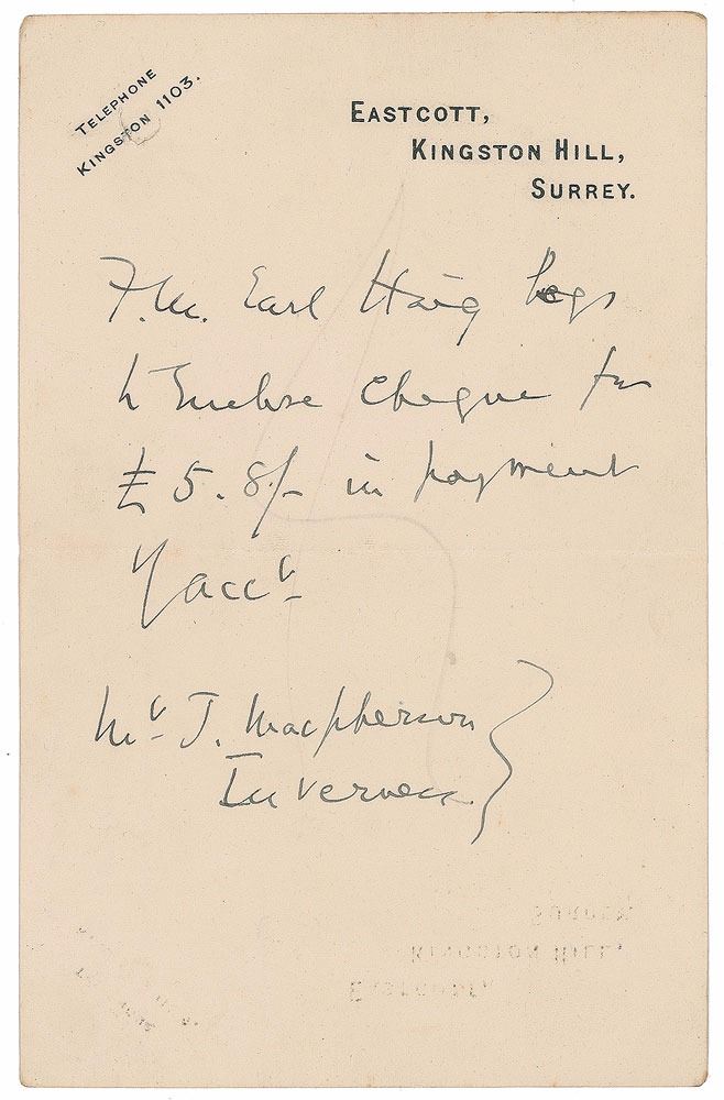 Field marshal and commander-in-chief of the British expeditionary forces in France and Flanders during WWI (1861-1928). Third person ANS, one page, 4.5 x 7, Eastcott, Kingston Hill, Surrey letterhead, September 14, 1921. Note directed to J. MacPherson, in full: "F. M. Earl Haig begs to Inclose cheque for £5.8/– in payment of acct." Includes original compliment card. In fine condition, with an erased pencil squiggle through the text.