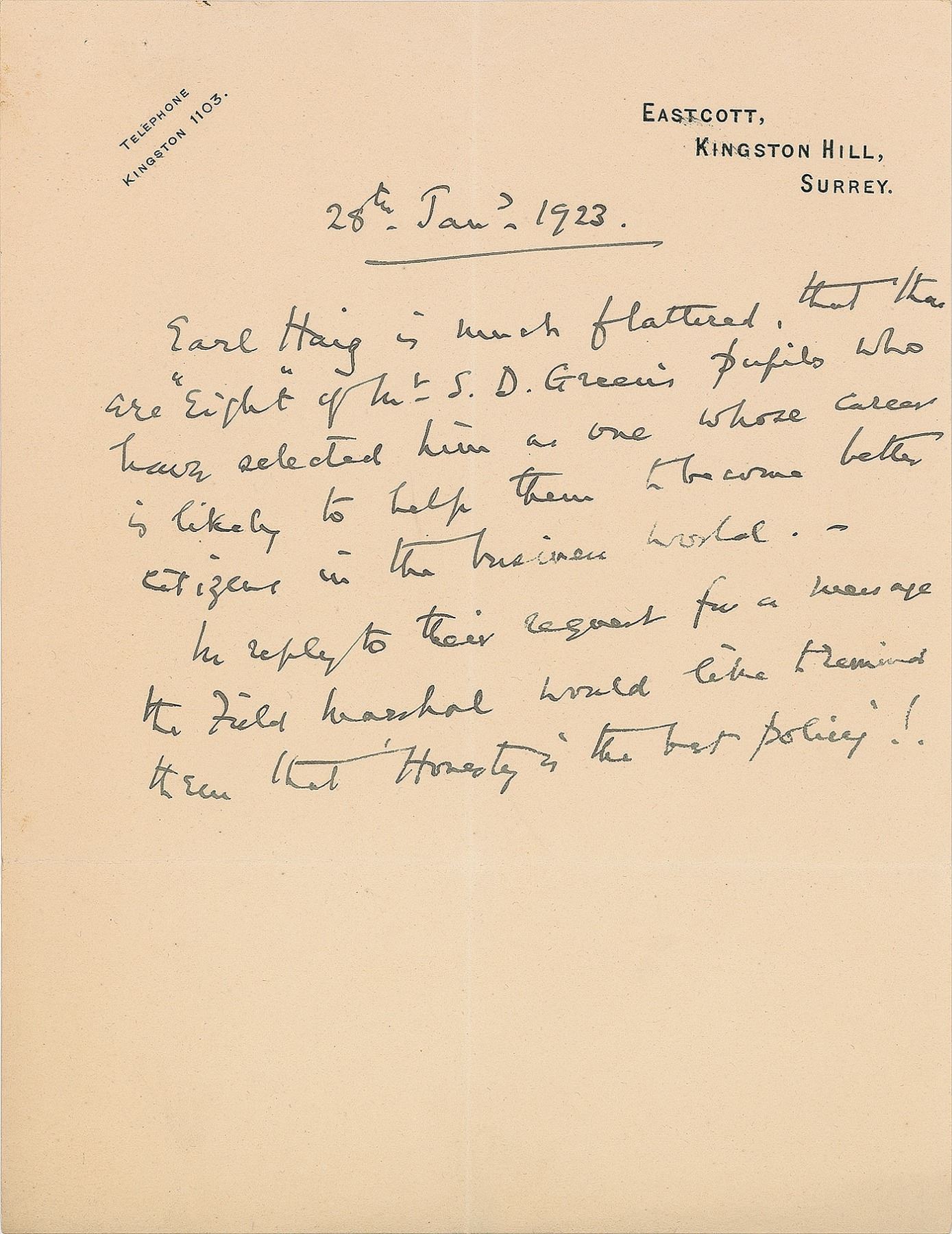Field marshal and commander-in-chief of the British expeditionary forces in France and Flanders during WWI (1861–1928). Third-person ALS signed within the text, “Earl Haig,” one page, 7 x 9, Eastcott, Kingston Hill, Surrey letterhead, January 28, 1923. In full: "Earl Haig is much flattered, that there are 'eight' of Mr. S. D. Green's pupils who have selected him as one whose career is likely to help them to become better citizens in the business world.—In reply to their request for a message the Field Marshal would like to remind them that 'Honesty is the best policy'!" In fine condition.