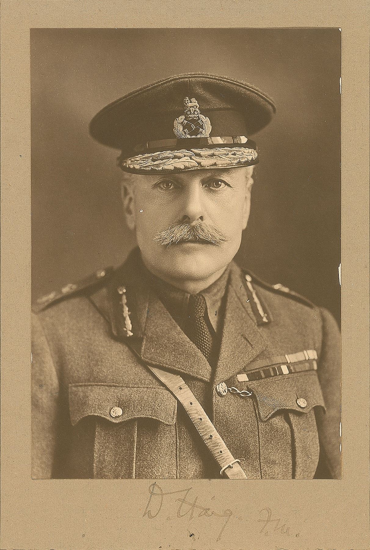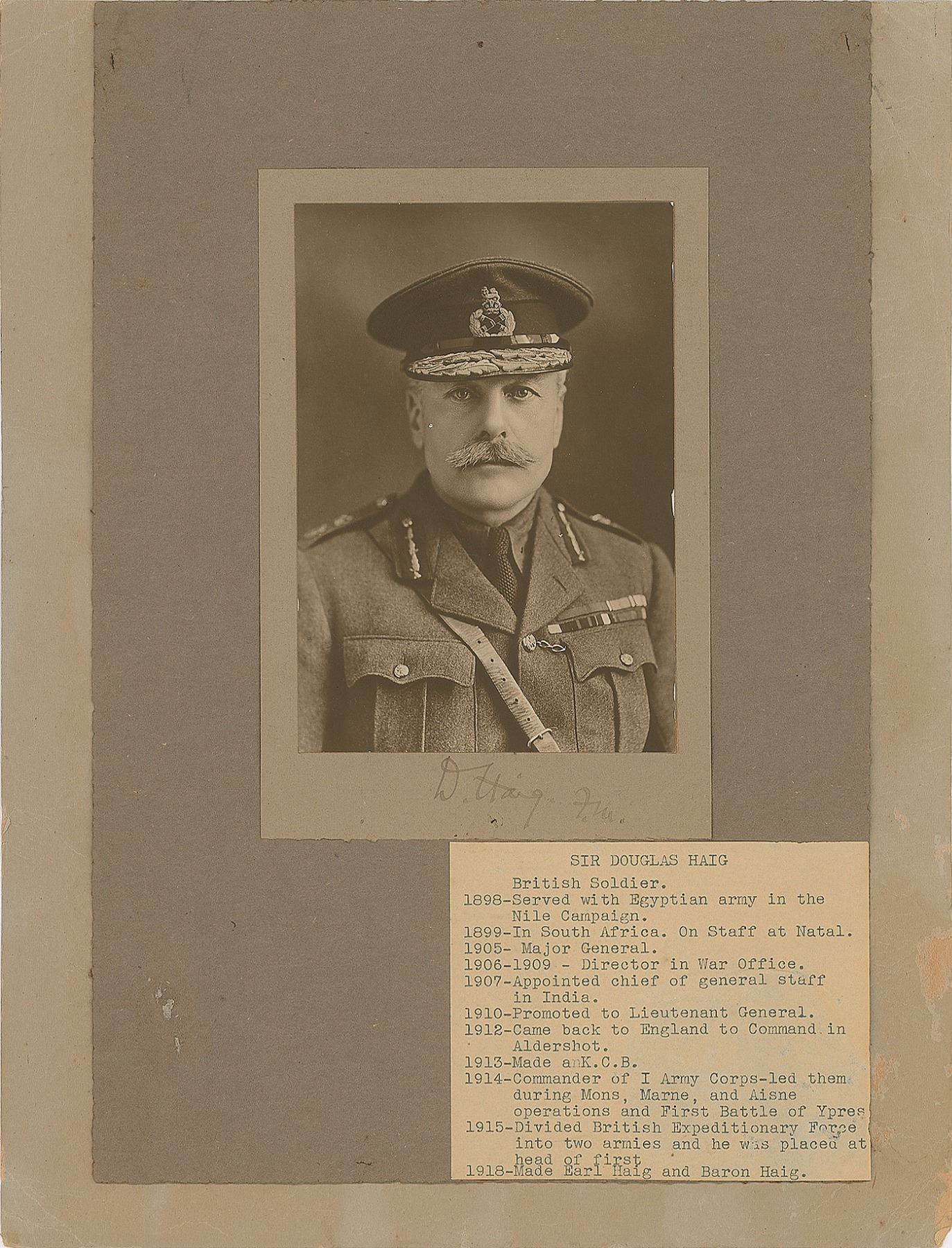 Field marshal and commander-in-chief of the British expeditionary forces in France and Flanders during WWI (1861–1928). Handsome matte-finish 3.75 x 5.5 photo of Haig in uniform, affixed to a 4.5 x 7 mount, signed on the mount in fountain pen, "D. Haig, F. M." The photo's mount has been tipped to larger display sheet. In fine condition, with a light crease to the lower right corner.