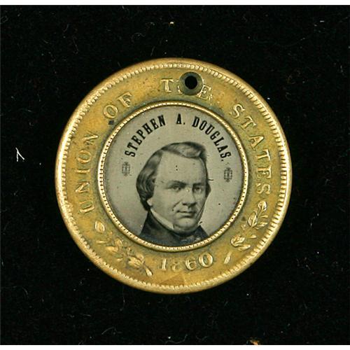 <Our item number 132218><B>Douglas/Johnson Rare 1860 Jugate Ferrotype.</B> 23mm, with clean, sharp images of Stephen A. Douglas on one side and Herschel V. Johnson on the other. Douglas' side is inscribed "Union of the States 1860" and Johnson's side "The Constitution and the Laws 1860." Normal ribbon hole at top; slight tarnish on small part of reverse rim. Occurs at auction far less frequently than the Lincoln/Hamlin 1860 ferrotype. <BR>Estimated Value $500 - 600. <BR><BR>Our item number 132218<BR><IMAGES><P ALIGN="CENTER"><IMG SRC="http://www.goldbergcoins.net/liveauction/49jpegs/132218.jpg"> </P></IMAGES>