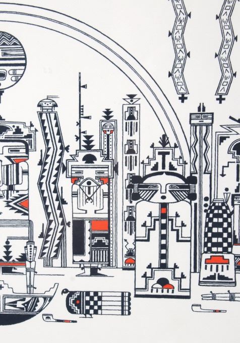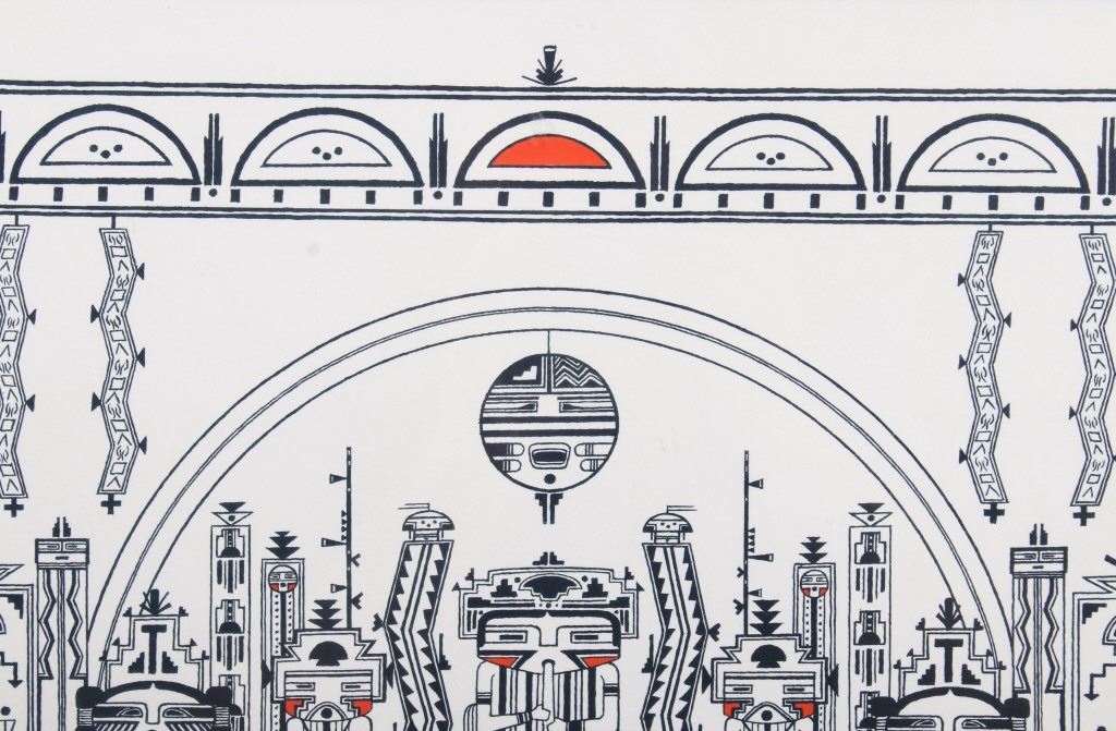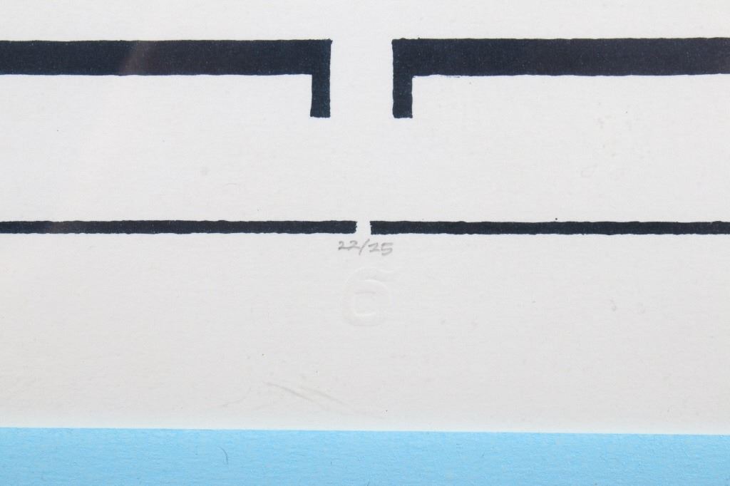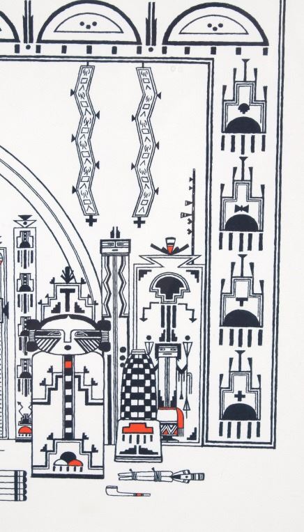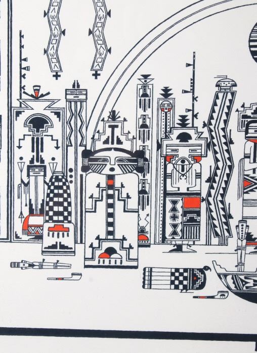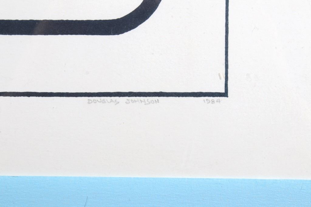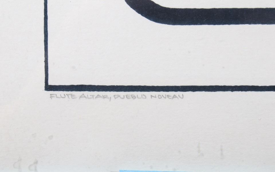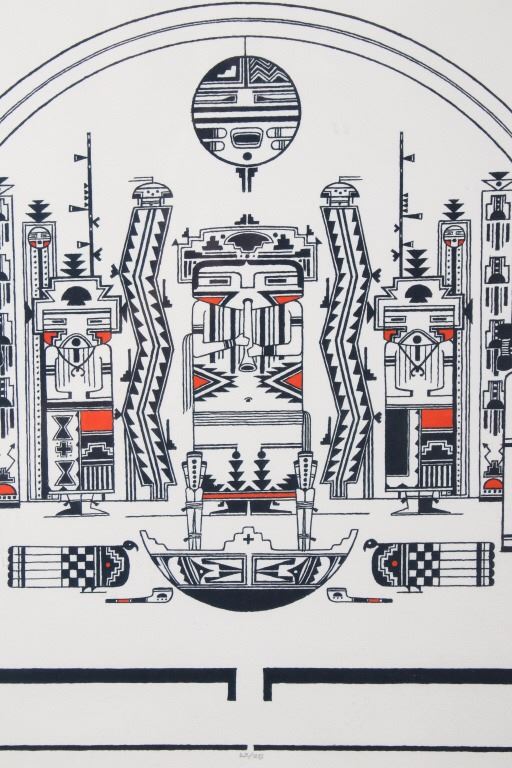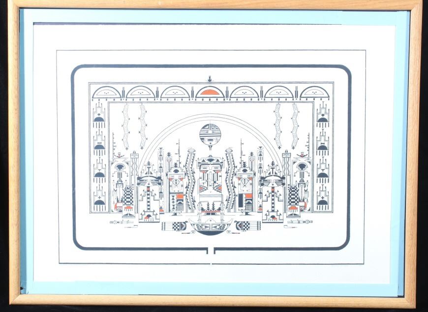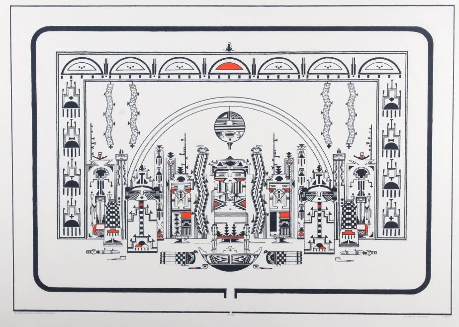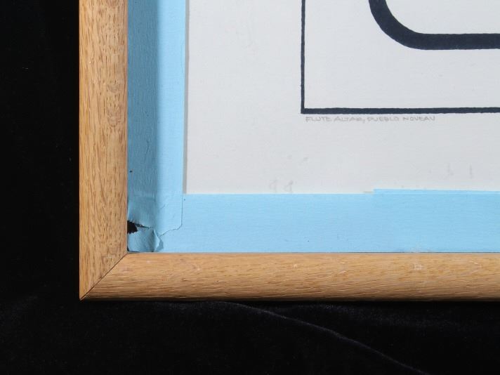 Featured in this lot we have a signed Douglas Johnson limited edition lithograph titled "Flute Alter, Pueblo Noveau". Douglas Johnson is an American artist know for his depictions of Southwest Native Americans and daily life. Johnson is heavily influenced by Native American, particularly Navajo art work and it's reflected in his art style. This piece shows buildings, figures, and animals made of geometric patterns and shapes. The piece shows five Native American figures towards the center with the figure at the middle playing a flute. The figures and designs show black lines and coloration with some sections of orange. The piece is marked in the bottom left hand side reading "Flute Alter, Pueblo Noveau", marked "22/25" in the bottom center, and marked "Douglas Johnson 1984" in the right hand corner. The piece is set into a wood frame with a black and white border, along with a border of blue tape. Provenance: From the renowned Sundog Fine Art Bozeman, Montana collection and collected by Bruce VanLandingham. Bruce VanLandingham was a pillar in the American Indian collecting community and a respected expert. Along with being an avid collector Bruce also was the sole owner of Sundog Fine Art Gallery in Bozeman which was both part museum and gallery. The piece shows good condition with some light wear across the back of the frame. The frame measures 29 1/2" wide by 22 1/4" tall with the art measuring 22 1/4" wide by 15 1/2" tall.