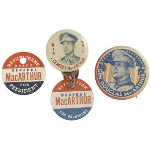 <B>Douglas MacArthur: Two Campaign Buttons and One Paper Tag.</B></I> Various sizes. The largest button is 1 1/4” and the smallest 1”. One faded, the others are fine.<BR><BR><b>Shipping:</b> Miscellaneous Collectibles, Smal (<a target="_blank" href="http://www.heritageauctions.com/common/shipping.php">view shipping information</a>)