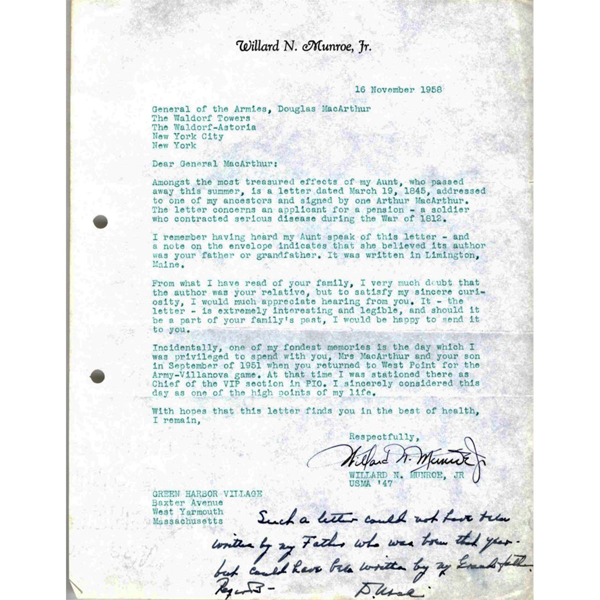 Douglas MacArthur autograph note signed, responding to a letter dated 16 November 1958 from a Willard Munroe. Munroe, who is in possession of a letter from an Arthur MacArthur, asks if it could be the General's father. MacArthur writes, ''Such a letter could not have been written by my Father who was born that year -- but could have been written by my Grandfather. Regards - D. McA.'' Mild toning and creasing to 8.5'' x 11'' letter, else very good.