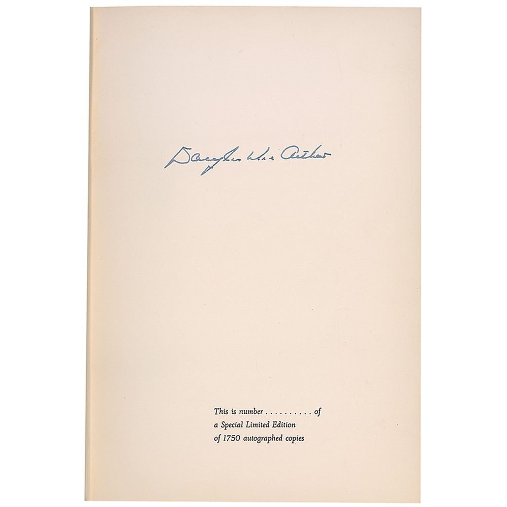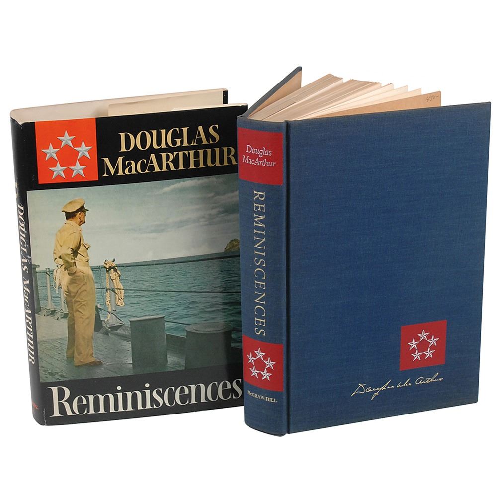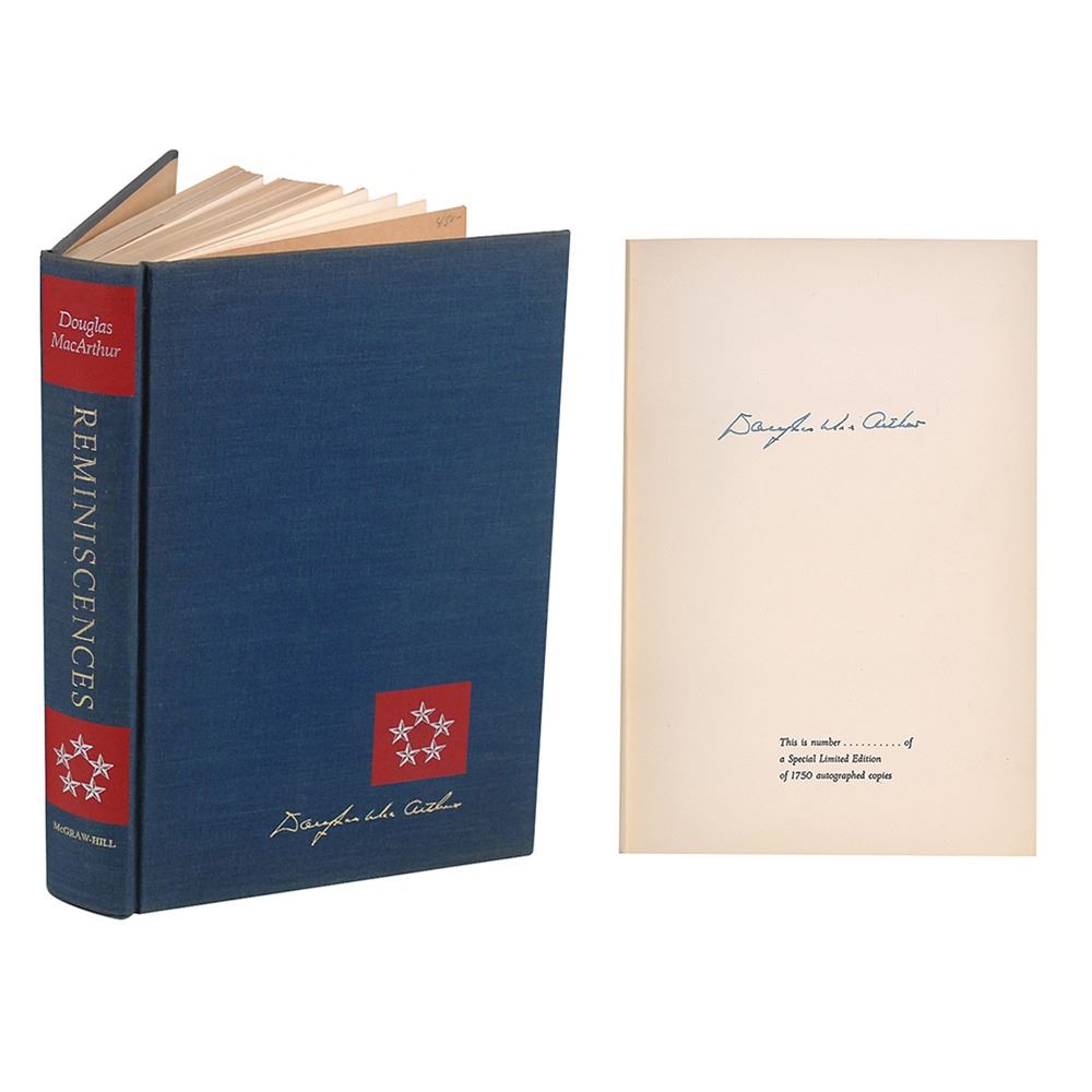 Signed book: Reminiscences. First edition, limited issue of 1750. NY: McGraw-Hill, 1964. Hardcover with dust jacket, 6.5 x 9.5, 438 pages. Signed on the colophon in fountain pen by Douglas MacArthur. Autographic condition: fine. Book condition: VG+/VG+. Navy cloth-covered boards with gilt titles; slightly yellowed; minor creasing to ffep. Dust jacket in protective mylar sleeve; few small tears to edges; lightly rubbed (heavier along spine and folds); price-clipped.