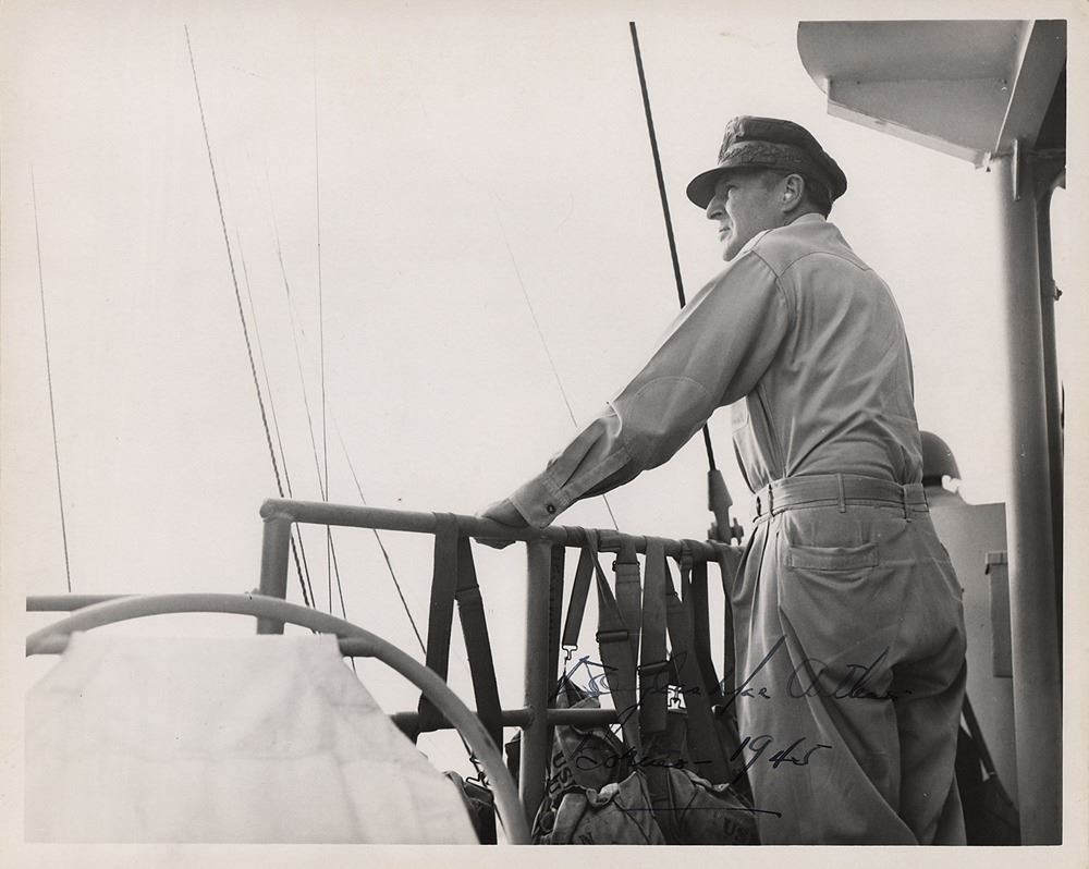 Historic vintage matte-finish 10 x 8 photo of Douglas MacArthur on board the USS Cleveland in 1945, neatly signed in fountain pen, "Douglas MacArthur, Borneo 1945." Reverse is stamped: "Official Photograph, U.S.S. Cleveland." In fine condition, with scattered small surface dings. Accompanied by five additional glossy 4 x 5 photos of MacArthur on the USS Cleveland, two with facsimile signatures inherent to the image.