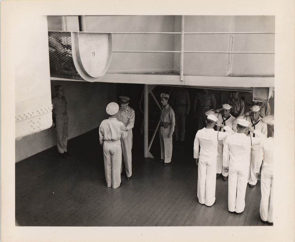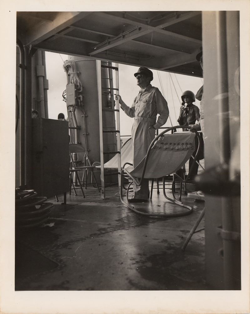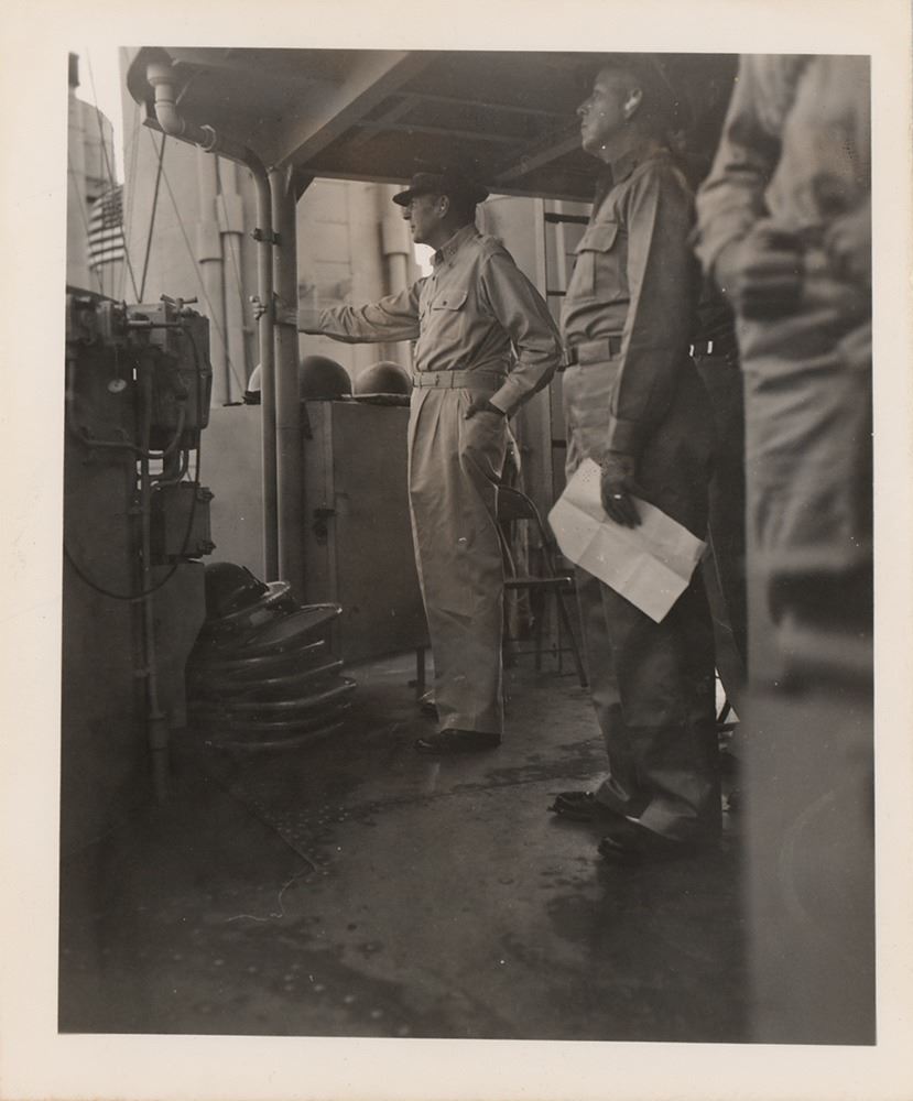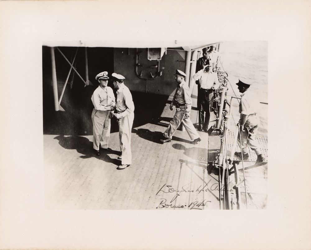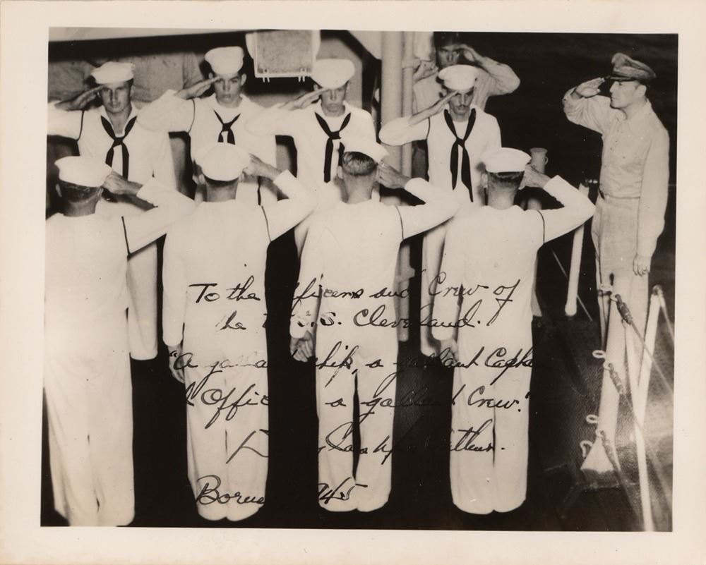 In the closing chapters of the Pacific Theater of World War II, the USS Cleveland put out from Subic Bay on June 7th to act as part of the covering force and provide fire support for the invasion landings at Brunei Bay, Borneo, on June 10th. She returned to Subic Bay on June 15th, then sailed to Manila to embark General of the Army Douglas MacArthur and his staff as observers of the assault on Balikpapan, the last major amphibious landing of World War II. Just weeks later, the atomic bombs would be dropped on Hiroshima and Nagasaki, and the long conflict would draw to a close. A remarkable, historic photograph of MacArthur at war's end.