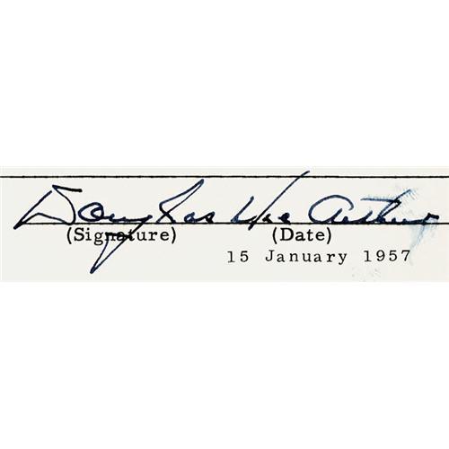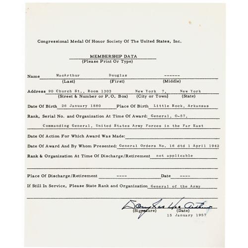 <B>Douglas MacArthur Signed Application- Congressional Medal of Honor Society.</B></I> One page, partly printed, filled in by typewriter, np, January 15, 1957. The Medal of Honor Society was founded in 1890 in order to protect the integrity of the Medal of Honor. MacArthur won his medal for "…conspicuous leadership in preparing the Philippine Islands to resist conquest, for gallantry and intrepidity above and beyond the call of duty in action against invading Japanese forces, and for the heroic conduct of defensive and offensive operations on the Bataan Peninsula..." On this application, MacArthur gives his date and place of birth, address, and rank. Fine condition; horizontal folds, two tiny stains at top right.
