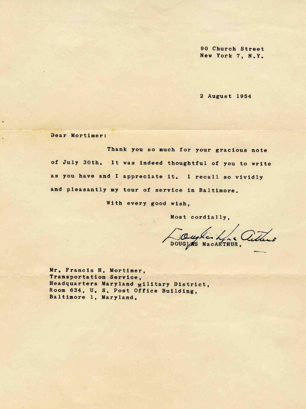 Typed letter signed by Douglas MacArthur. Letter dated 2 August 1954 reads in part ''Thank you so much for your gracious note, recall so vividly and pleasantly my tour of service in Baltimore.'' Letter is signed to bottom right corner in dark ink. Measures 8'' x 10.5''. Contains two horizontal folds, overall excellent condition.